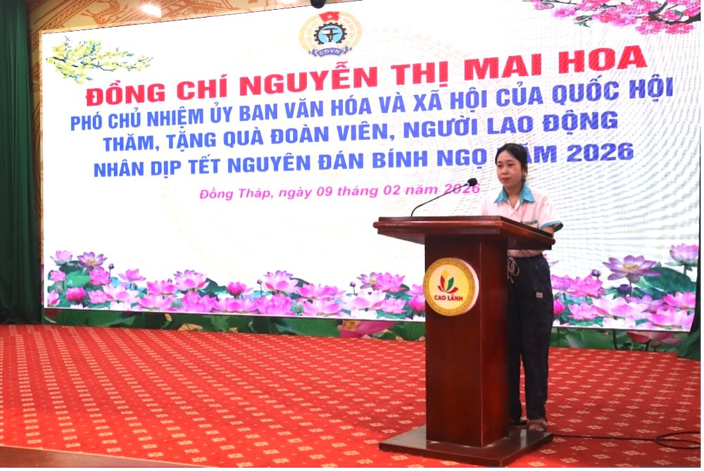 Đại biểu Quốc hội Nguyễn Thị Mai Hoa trao quà Tết cho đoàn viên, người lao động có hoàn cảnh khó khăn.Tham dự chương trình có bà Nguyễn Thị Mai Hoa - Phó Chủ nhiệm Ủy ban Văn hóa và Xã hội của Quốc hội; bà Huỳnh Thị Tuyết Vui - Tỉnh ủy viên, Phó Chủ tịch Ủy ban Mặt trận tổ quốc Việt Nam tỉnh Đồng Tháp, Chủ tịch Liên đoàn Lao động tỉnh; ông Nguyễn Thanh Tuấn - Phó Chủ tịch Liên đoàn Lao động tỉnh; đại diện lãnh đạo Đảng ủy, UBND, Ủy ban MTTQ Việt Nam, Công đoàn phường Cao Lãnh cùng 50 đoàn viên, người lao động có hoàn cảnh khó khăn trên địa bàn các phường, xã.