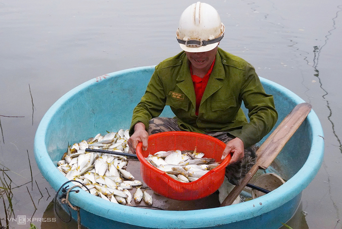 Lưới ngấm nước khá nặng, ông Hào chèo thuyền thúng ra giữa sông, dùng cây gậy dài hơn một mét khua dưới đáy lưới để dồn cá vào một góc và giúp thoát bớt nước. Ông nhanh tay gom cá ở đáy và mở dây buộc, thả cá rơi xuống rổ nhựa phía dưới.