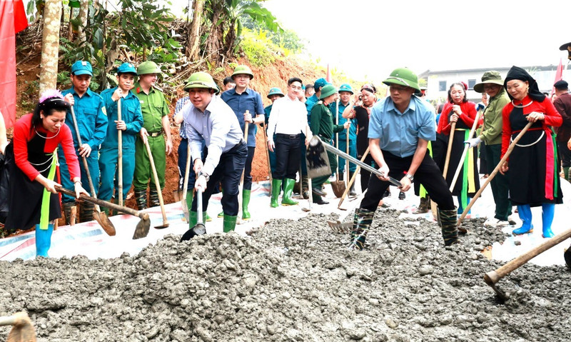 Bí thư Tỉnh ủy và Chủ tịch UBND tỉnh Lào Cai trực tiếp xuống thôn, cùng người dân xúc vữa, đổ bê tông, mở những mét đường đầu tiên của phong trào xây dựng đường giao thông nông thôn năm 2026.