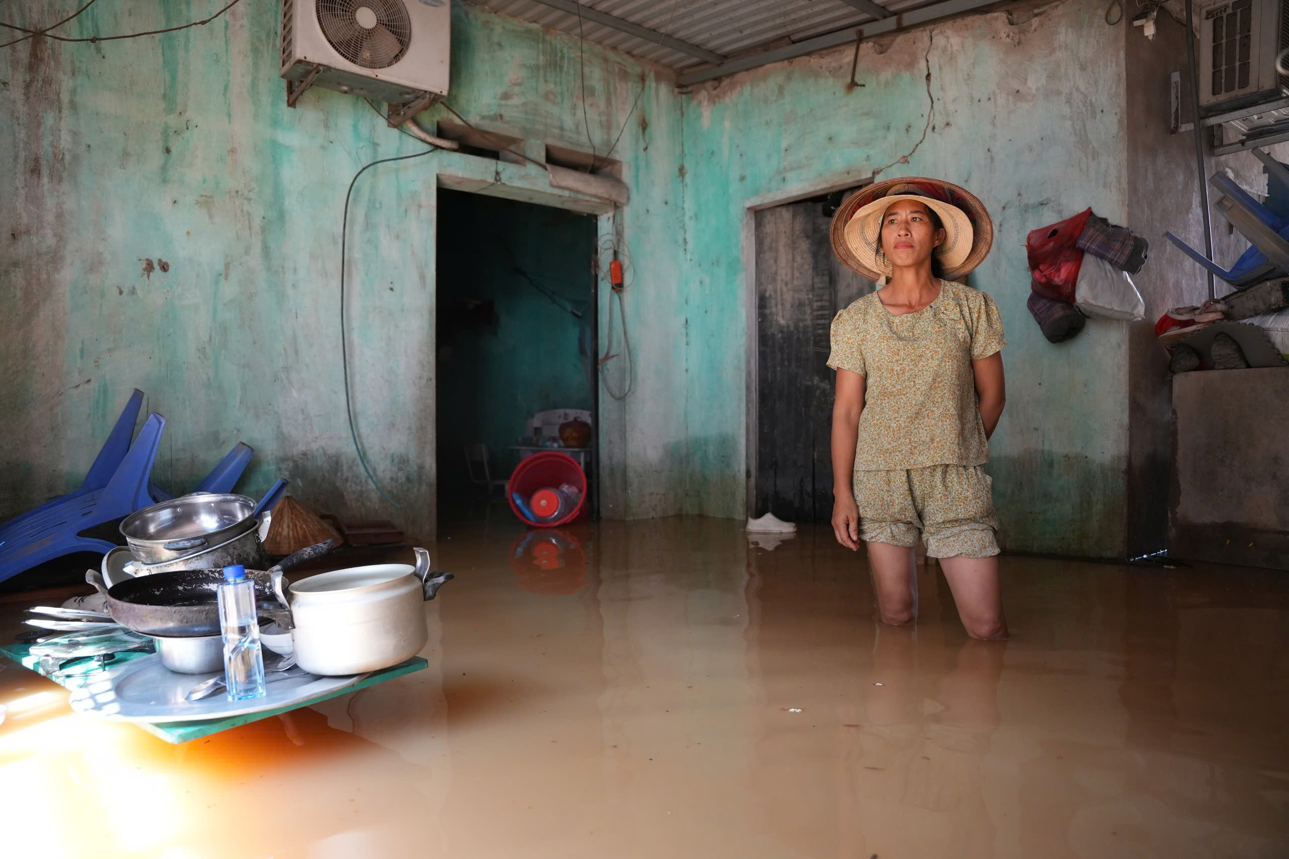 "Năm nay, nước ngập tràn, chỗ nào cũng bì bõm đến bụng, đến ngực, mọi sinh hoạt đời thường gần như tê liệt", người phụ nữ 40 tuổi kể.