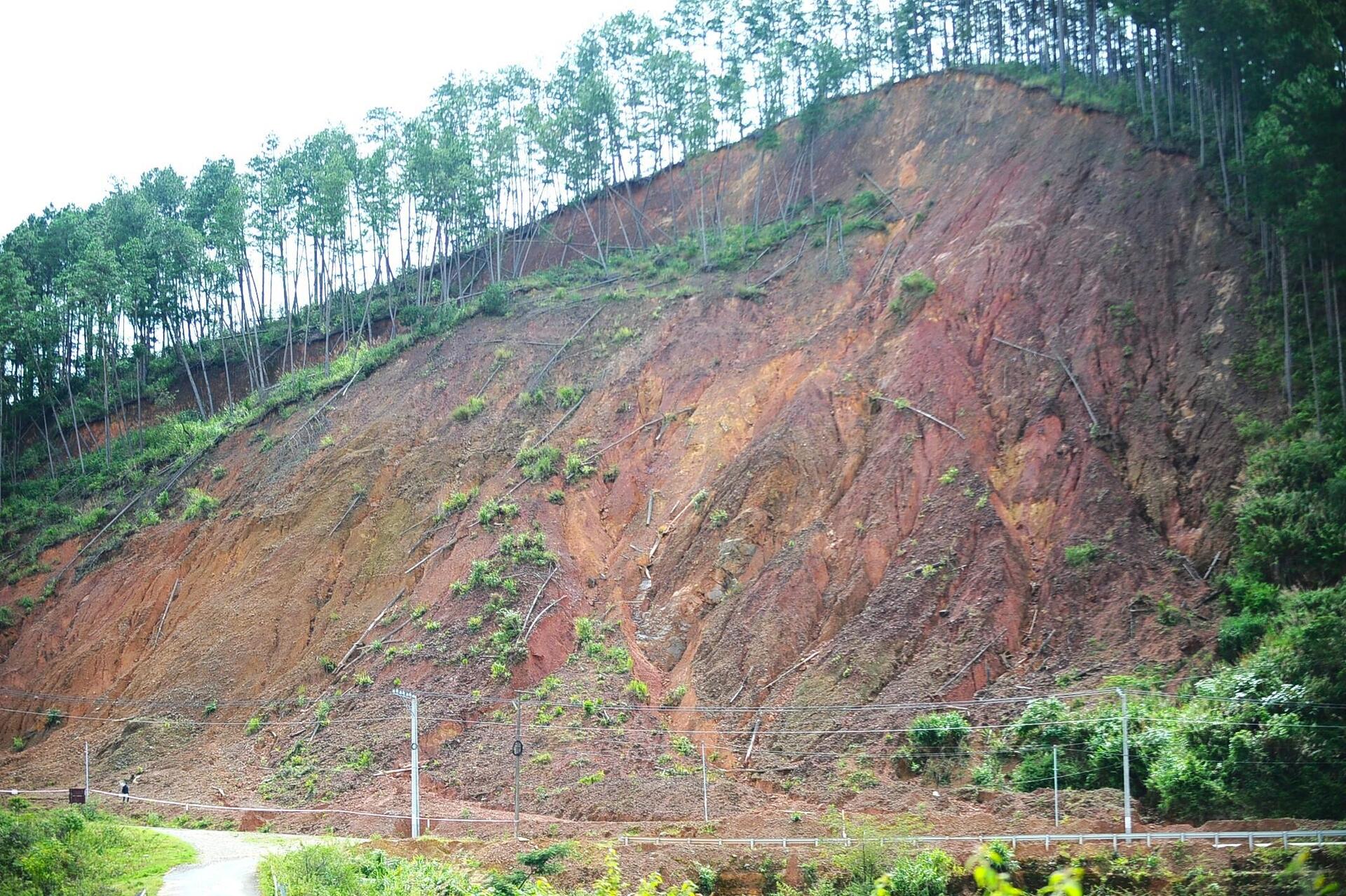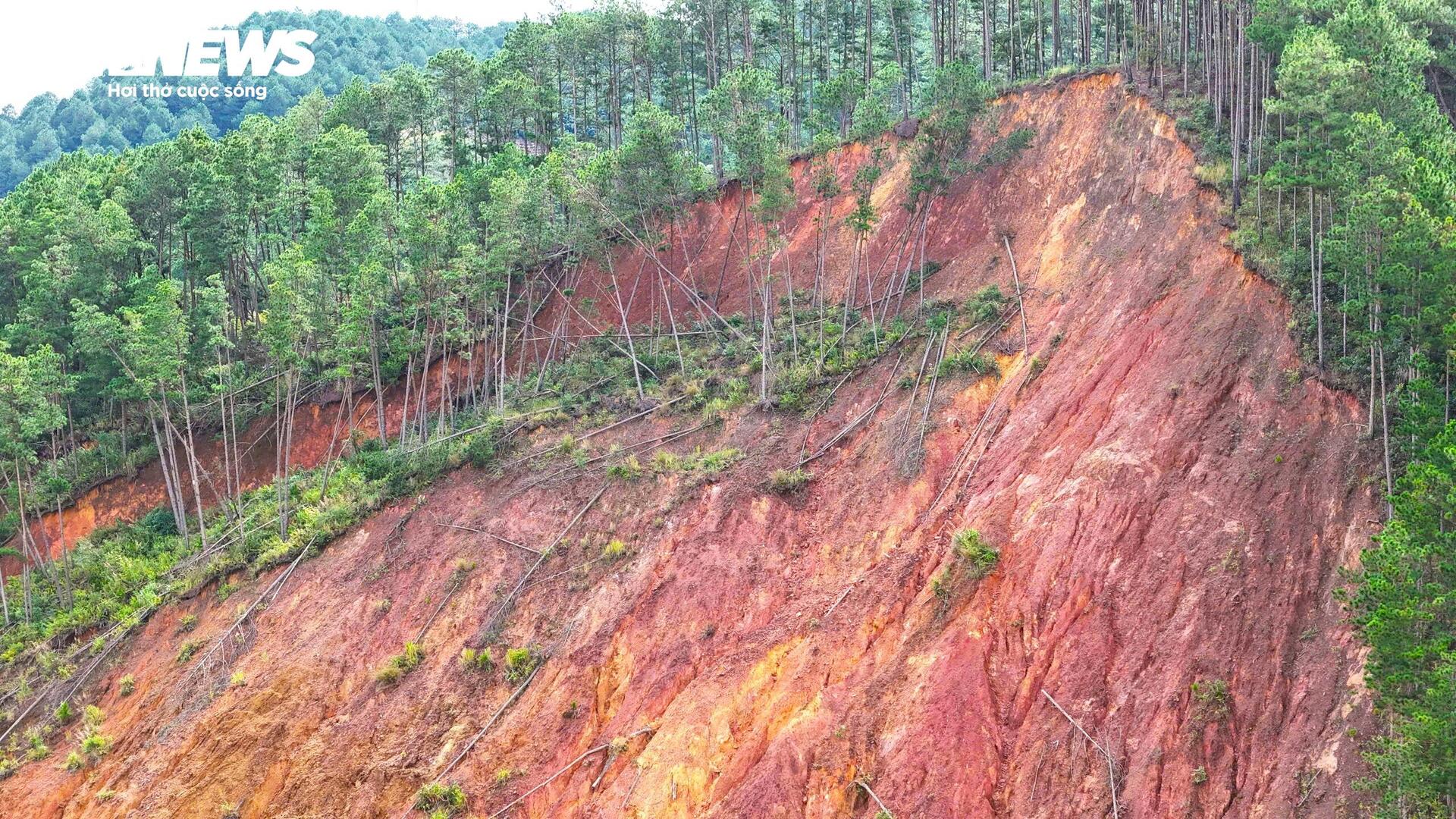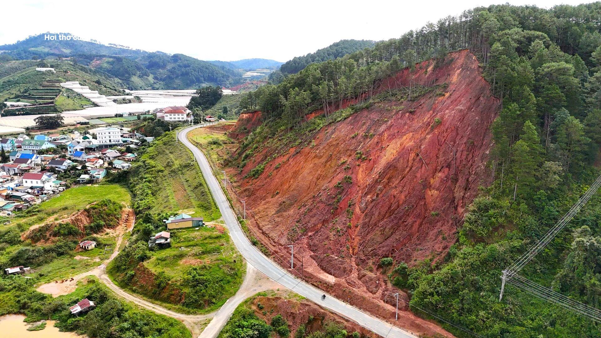 Quả đồi này nằm gần cửa dẫn nước thủy điện Đạ Dâng - Đạ Chomo. Sau nhiều ngày mưa lớn, gần 1/3 thân đồi đã bị khoét sâu, hàng trăm mét khối đất đá trượt xuống, cây thông bật gốc.