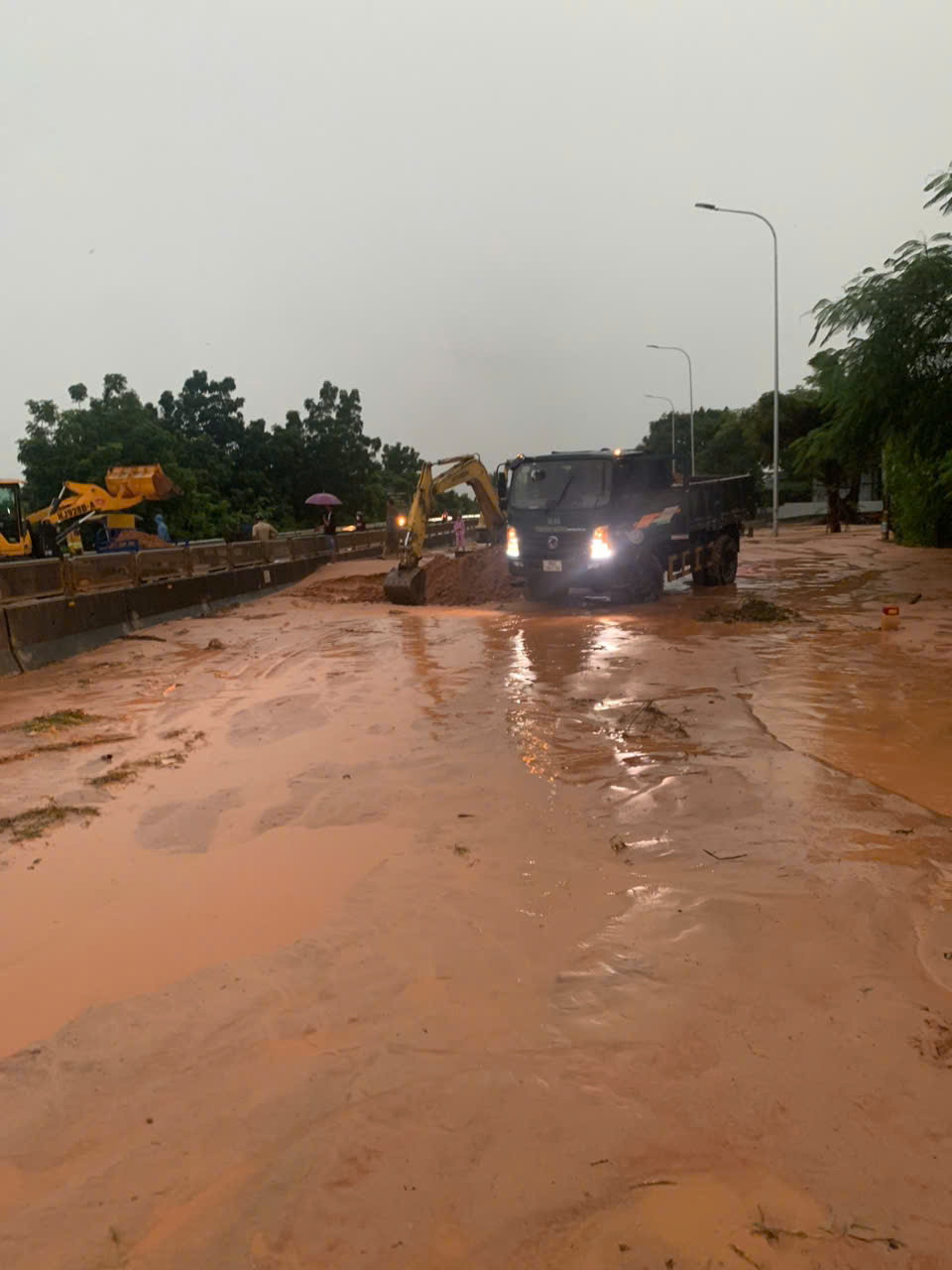 Ông Võ Tiến Trung, Chủ tịch UBND xã Lương Sơn, cho biết địa phương đã điều gần chục xe múc, xe đào, xe ben đến hiện trường xúc dọn, mở đường thoát nước và giải phóng lượng cát đỏ. "Công việc được triển khai ngay khi sự cố xảy ra, hy vọng sớm thông xe một làn hướng Bắc - Nam trước", ông nói.