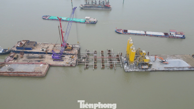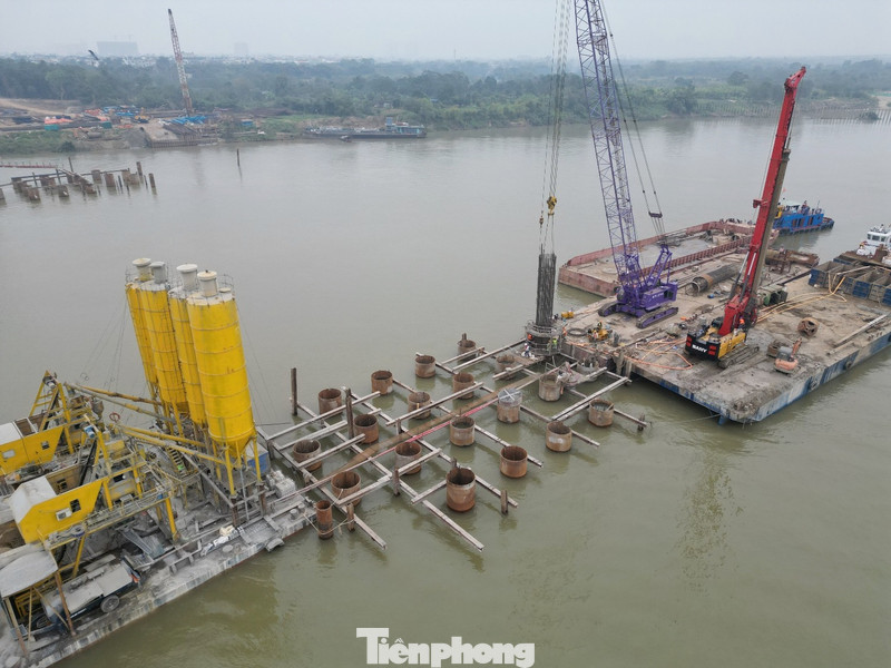 Báo điện tử Tiền Phong Hiện các nhà thầu đang thi công tổng thể các trụ cầu ở giữa sông, hạng mục thi công là cọc khoan nhồi (chân các trụ cầu cắm ở lòng sông, sâu khoảng 60 mét). 1