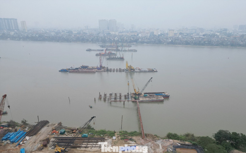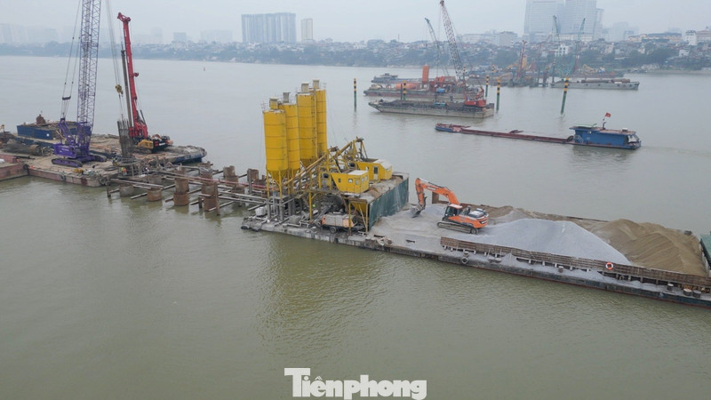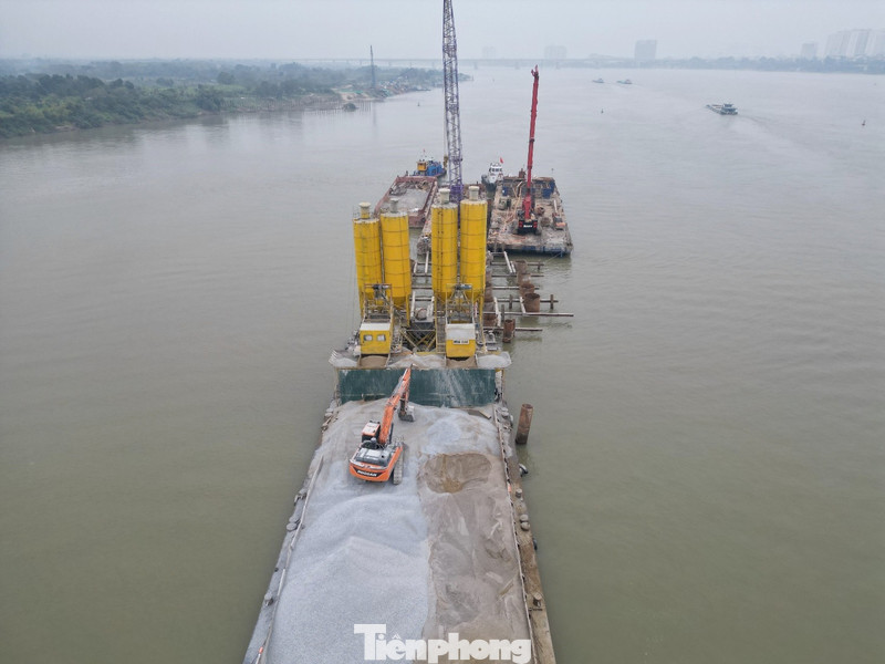 Báo điện tử Tiền Phong Với những trụ cầu ở giữa lòng sông, các nhà thầu đã dùng sà lan, thiết bị nổi đặc chủng nổi trên mặt sông Hồng để máy móc có thể đứng, tiến hành khoan, đóng cọc. 1
