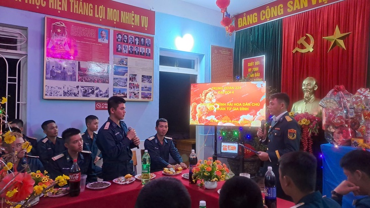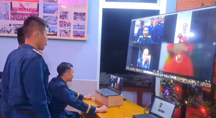 Bộ đội tại Trạm rada 29 trên đỉnh Sơn Trà (Đà Nẵng) chúc Tết người thân qua "cầu truyền hình" từ đơn vị - Ảnh: KHẢI ĐĂNG"Bộ đội làm nhiệm vụ do yêu cầu, quy định nên không được sử dụng điện thoại. Đêm giao thừa, chúng tôi phân công lịch trực, các hoạt động chào đón giao thừa cũng được tổ chức.