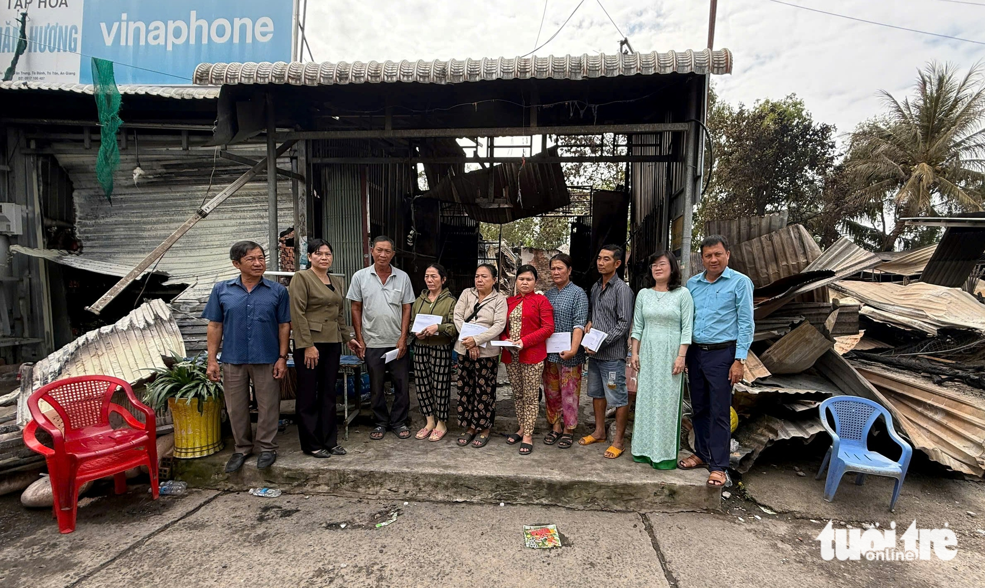 Lãnh đạo Ủy ban Mặt trận Tổ quốc Việt Nam tỉnh An Giang và xã Cô Tô đến thăm hỏi, tặng quà cho 6 hộ có nhà bị thiêu rụi - Ảnh: MINH KHANG"Trước mắt, tỉnh và xã đã hỗ trợ bà con 15 triệu đồng/hộ để giúp bà con ổn định cuộc sống. Địa phương đang vận động và hỗ trợ bà con khắc phục hậu quả, sớm ổn định cuộc sống trở lại", bà Lan nói.