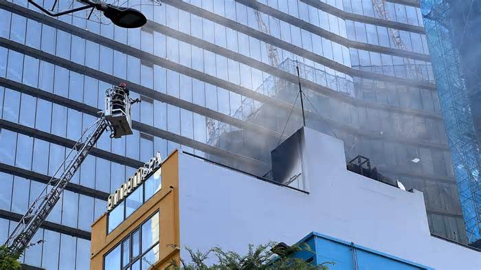 Khói lửa bùng lên từ sân thượng của spa 7 tầng trên đường Lê Thánh Tôn, phường Sài Gòn, cảnh sát triển khai xe thang cao hơn 20 m hỗ trợ người mắc kẹt, sáng 9/1.