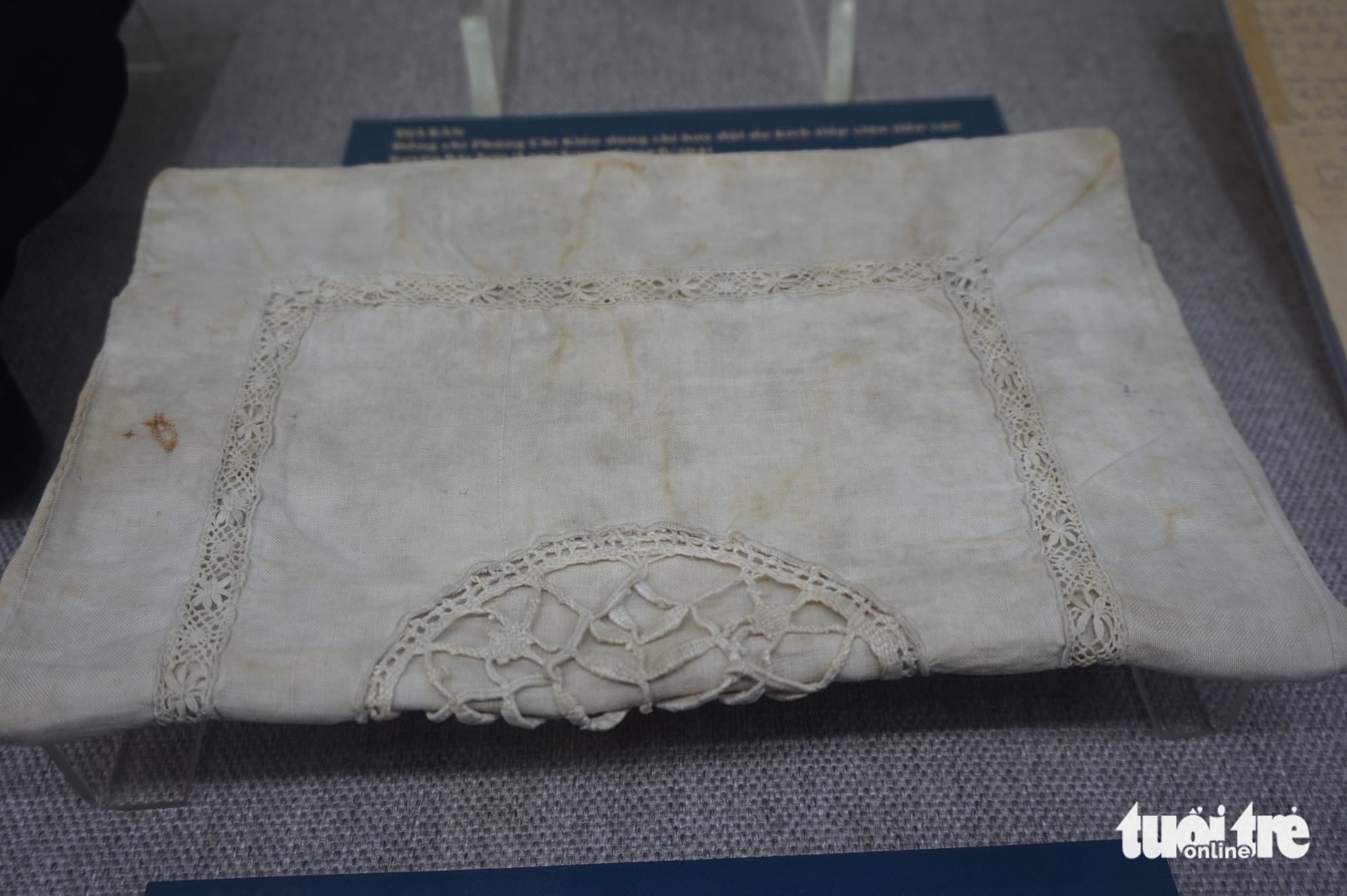 Một hiện vật xúc động ở trưng bày là chiếc áo gối nhà cách mạng Nguyễn Thị Minh Khai làm từ vải áo tù gửi tặng mẹ trong thời gian bà bị giam ở Khám Lớn, Sài Gòn năm 1940 - Ảnh: T.ĐIỂU