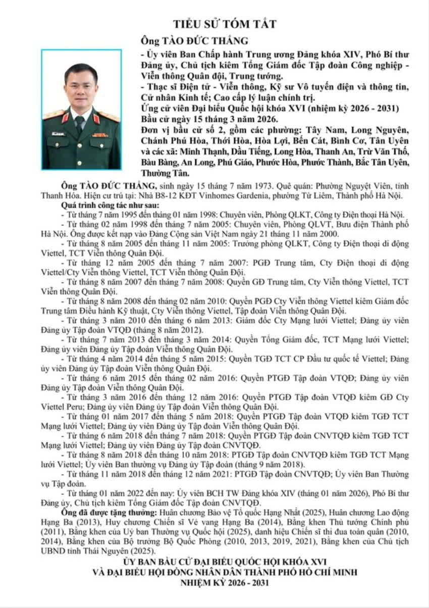 Trung tướng Tào Đức Thắng, Ủy viên BCH TW Đảng khóa XIV, Phó Bí thư Đảng ủy, Chủ tịch kiêm Tổng Giám đốc Tập đoàn Công nghiệp, Viễn thông Quân đội (Viettel), ứng cử đại biểu Quốc hội khóa XVI tại đơn vị bầu cử số 2 TP. Hồ Chí Minh, gồm các phường: Tây Nam, Long Nguyên, Chánh Phú Hòa, Thới Hòa, Hòa Lợi, Bến Cát, Bình Cơ, Tân Uyên và các xã: Minh Thạnh, Dầu Tiếng, Long Hòa, Thanh An, Trừ Văn Thố, Bàu Bàng, An Long, Phú Giáo, Phước Hòa, Phước Thành, Bắc Tân Uyên, Thường Tân.