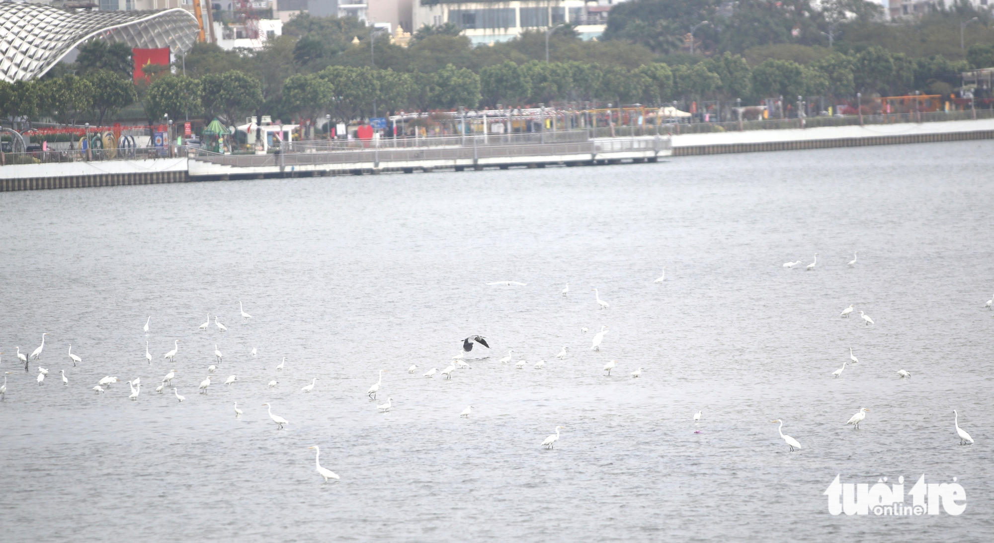 Tại khu vực phía Bắc cầu Nguyễn Văn Trỗi (Đà Nẵng), đàn cò thảnh thơi kiếm ăn. Từng mảng trắng nổi bật giữa nền sông xanh khiến nhiều người đi đường thích thú dừng lại chiêm ngưỡng.