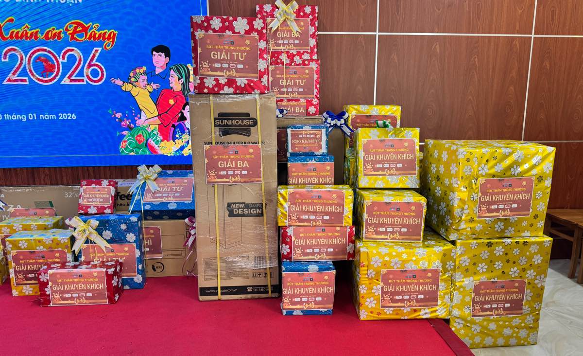 Các phần quà quay số may mắn tại công ty. Ảnh: Duy TuấnĐiểm nhấn của chuỗi hoạt động là chương trình rút thăm trúng thưởng được tổ chức kết hợp trực tiếp và trực tuyến.