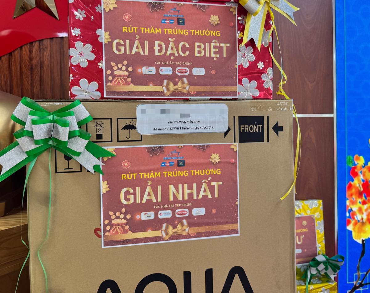 Giải đặc biệt và giải nhất trong chương trình. Ảnh: Duy TuấnSong song với chương trình quay số, công đoàn cơ sở đặc biệt quan tâm đến bữa ăn cuối năm của công nhân. Bữa cơm tất niên được tổ chức tại doanh nghiệp, với trị giá mỗi suất ăn 70.000 đồng.