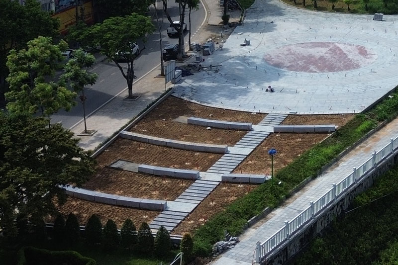 Công viên Hồ Chí Minh ở phường Lào Cai, cạnh sông Hồng. Ảnh: Đinh ĐạiKhông khí làm việc tại công trường khá khẩn trương, các tổ thi công được huy động đồng loạt để đẩy nhanh tiến độ.