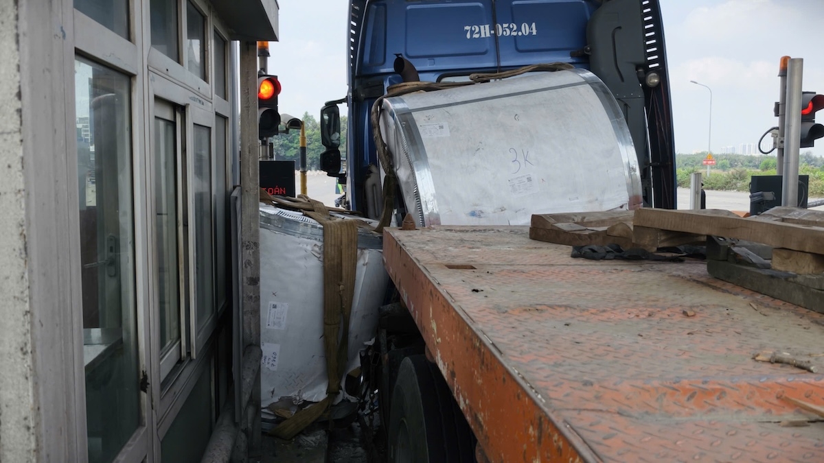 Khi đến trạm thu phí, hai cuộn thép bất ngờ đứt xích, lao về phía cabin và đầu kéo, làm gãy nhiều trụ thép. Theo nhân viên trạm, xe có thể đã phanh gấp khi qua cabin làm các cuộn thép theo quán tính lăn về trước và rơi khỏi xe.