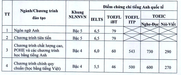 Điều kiện nhận hồ sơ, thí sinh có chứng chỉ tiếng Anh quốc tế trong thời hạn 2 năm tính đến ngày 01/6/2025 đạt IELTS 5.5 hoặc TOEFL iBT 46 hoặc TOEIC (4 kỹ năng: L&R 785, S 160, W 150) trở lên và có điểm thi tốt nghiệp THPT năm 2025 của môn toán và 1 môn khác môn tiếng Anh thuộc các tổ hợp xét tuyển của Đại học.