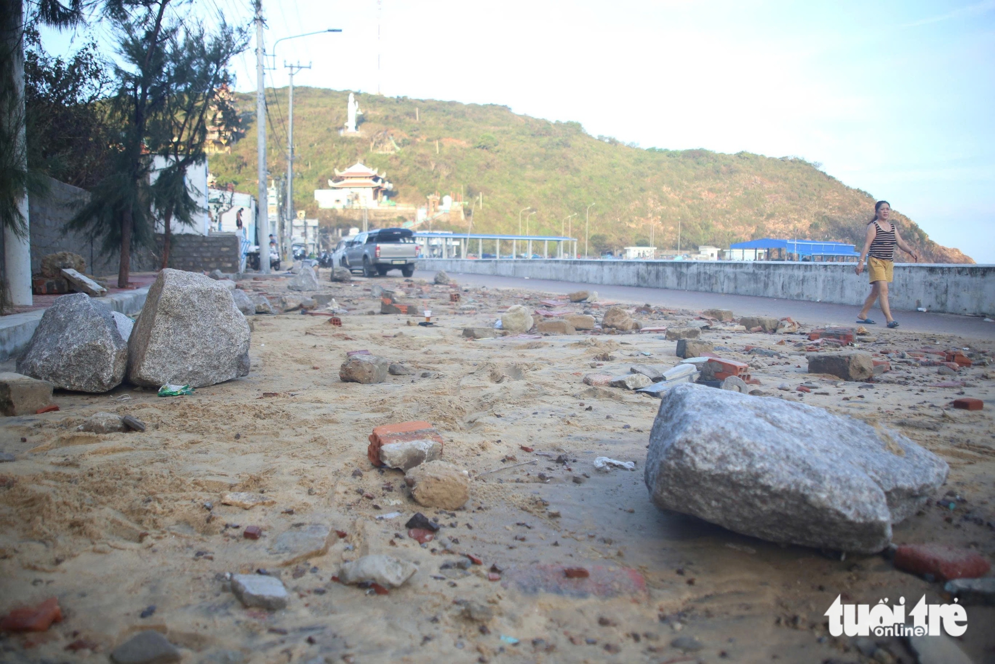 Nhiều tảng đá lớn dưới biển bị sóng biển đẩy lên bờ kè - Ảnh: MINH HÒA