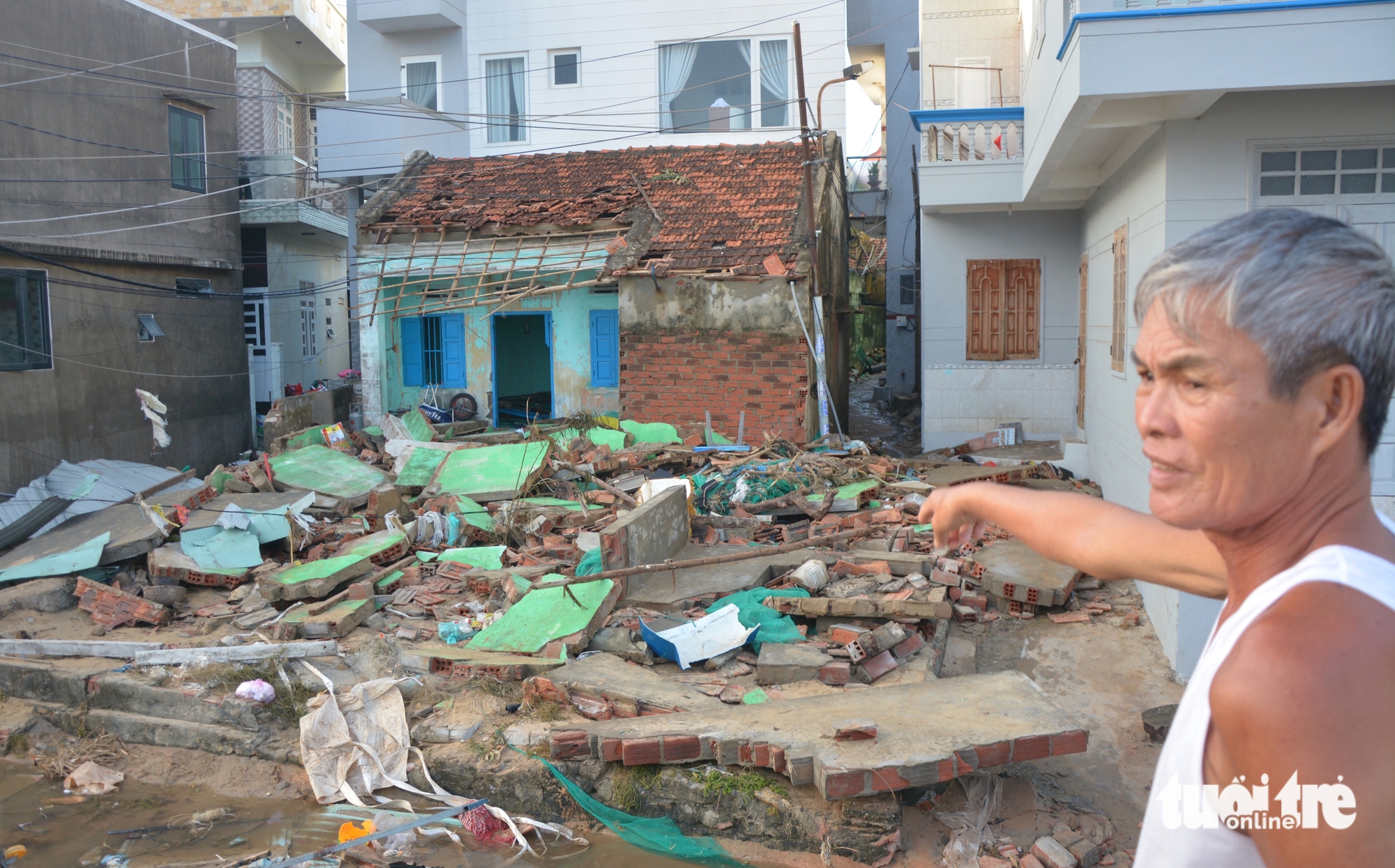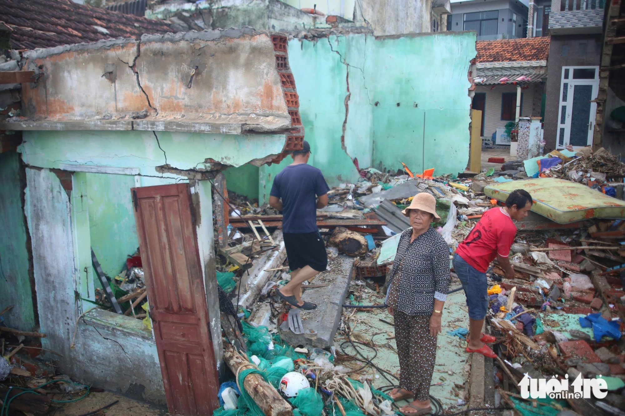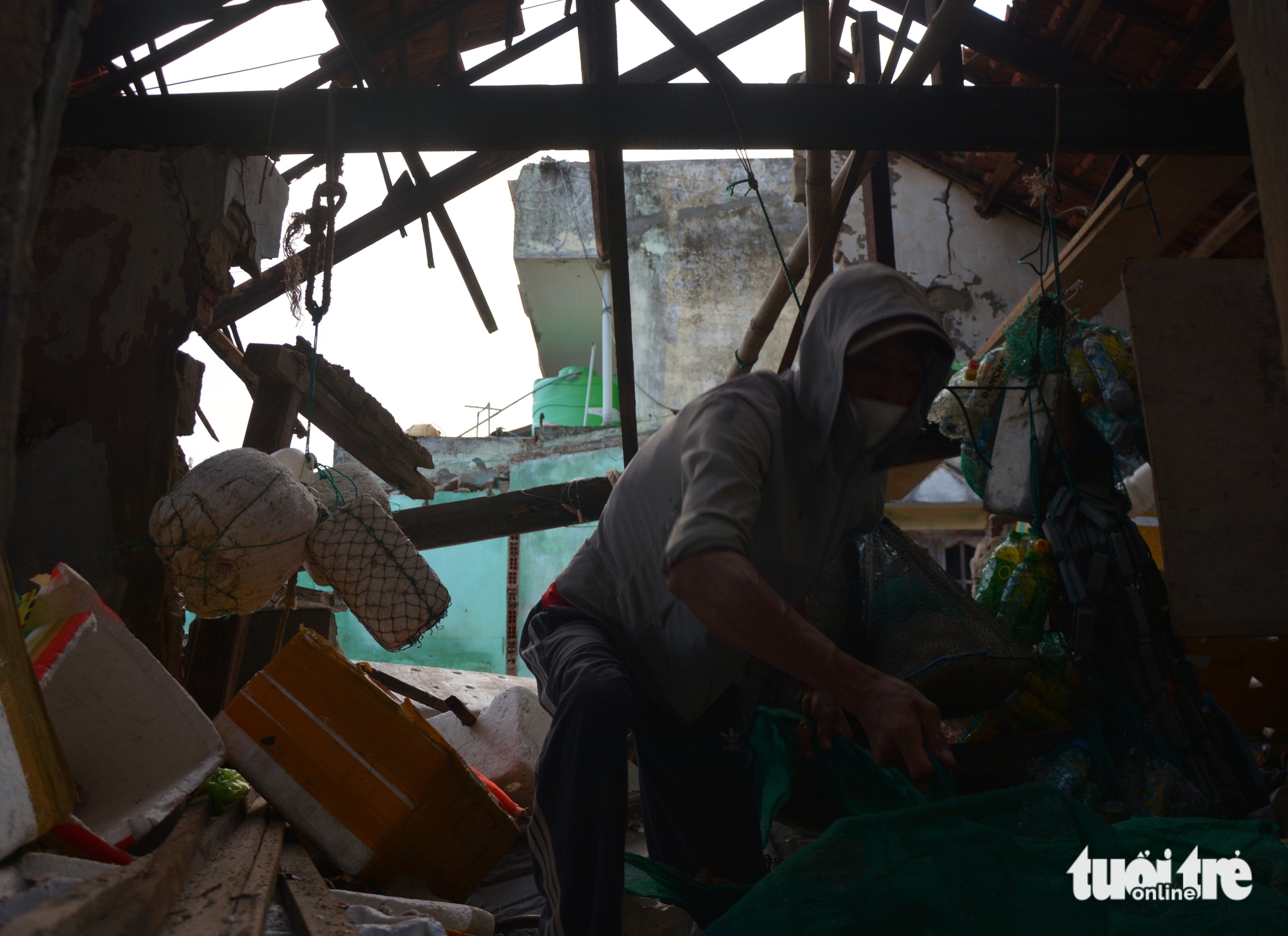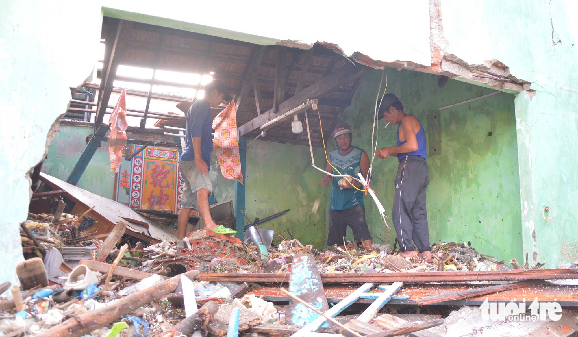 Căn nhà của anh Võ Văn Tùng ở làng chài Nhơn Lý đã bị sóng biển làm hư hại - Ảnh: ĐỨC TRONGBây giờ, vợ chồng anh Tùng phải dời đồ đạc sống tạm bợ người thân quen. Anh bấm bụng nhặt lại những mảnh vụn, đồ đạc sót lại. "Cái gì dùng được thì dùng, ráng vài hôm biển êm lại đi đánh cá kiếm tiền mà sống", anh Tùng chua chát nói.