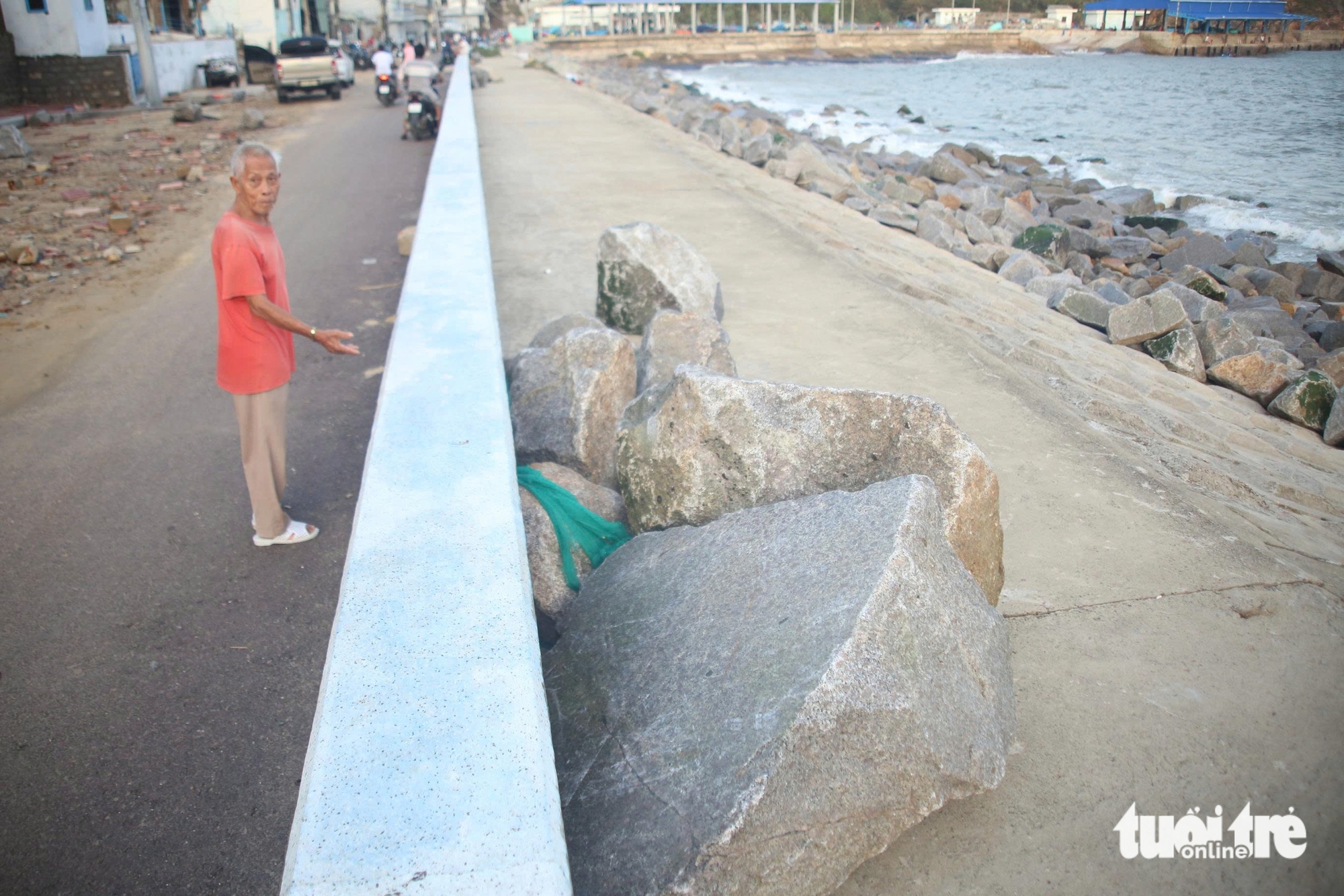 Nhiều tảng đá lớn bị sóng biển đẩy từ dưới biển văng vào bờ kè - Ảnh: MINH HÒA"Cả đời tôi chưa bao giờ thấy cơn bão nào có sức tàn phá dữ đến vậy", bà Ngô Thị Lanh, 70 tuổi, ở làng chài Nhơn Lý, thốt lên như thế. Bà kể trước khi bão Kalmaegi ập vào, chính quyền địa phương vận động dân lên chỗ cao hơn để trú ẩn.