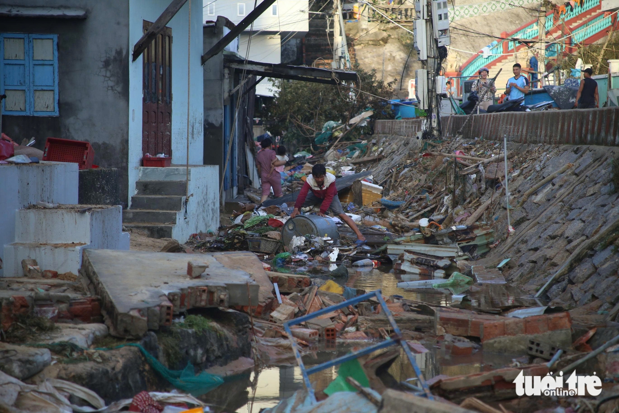 Người dân làng chài Nhơn Lý, phường Quy Nhơn Đông, tỉnh Gia Lai nhặt những mảnh sót lại trong đống đổ nát - Ảnh: ĐỨC TRONGChiều 7-11, dọc con đường ven biển ở làng chài Nhơn Lý vẫn ngổn ngang những tảng đá nặng hàng trăm ký bởi sóng biển cuộn ném từ dưới nước lên bờ. Đêm trước đó, khi cơn bão số 13 (Kalmaegi) đổ bộ, từng cột sóng cao như những căn nhà lầu nhiều tầng bổ ập vào khu dân cư, nuốt chửng nhiều ngôi nhà.