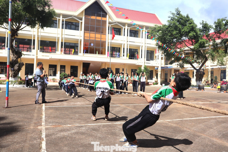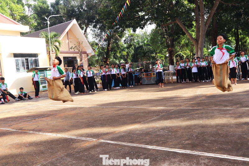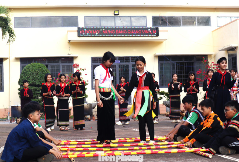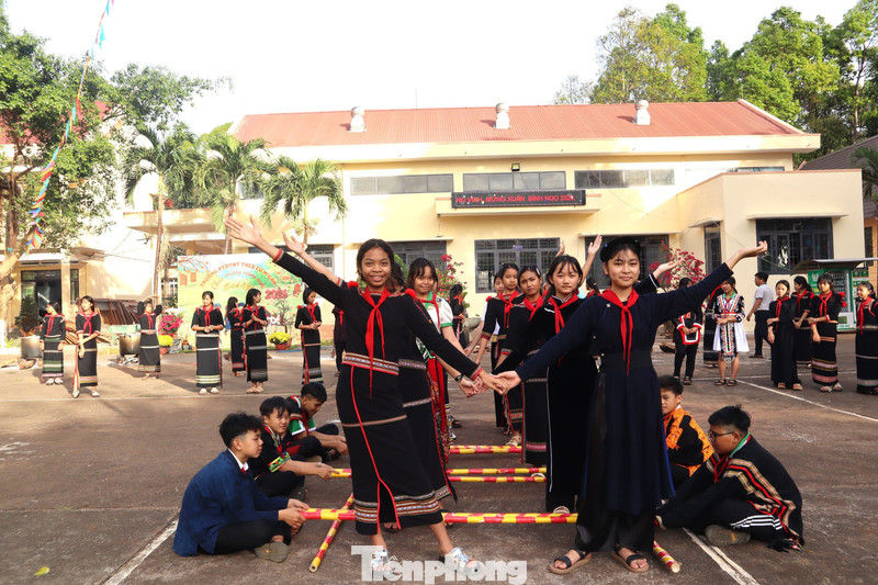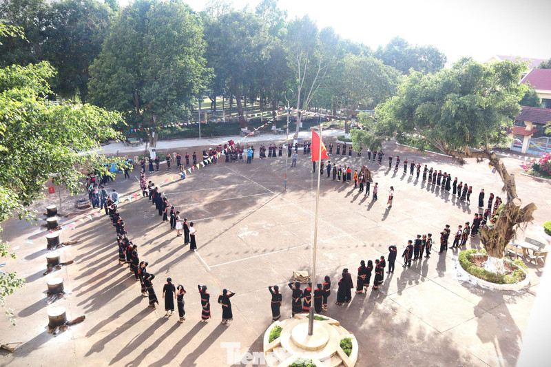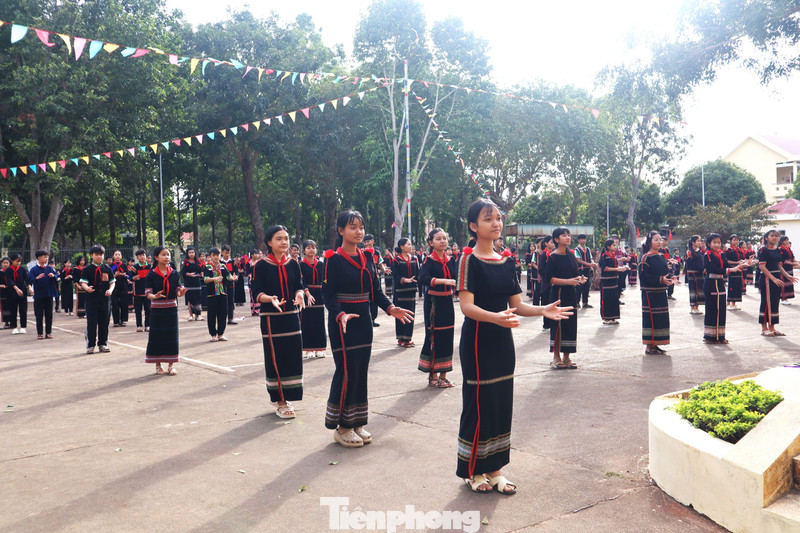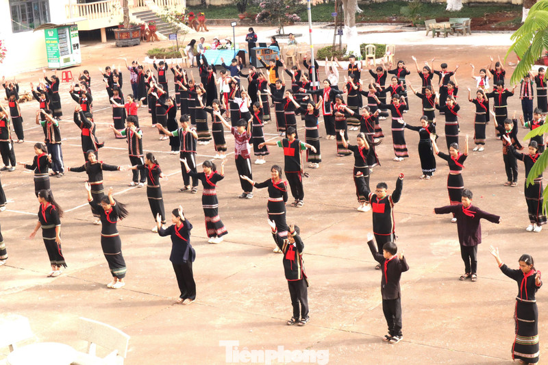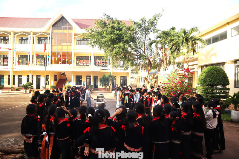 Học sinh 13 dân tộc anh em khoác lên mình những bộ trang phục truyền thống rực rỡ. Sân trường trở thành không gian thổ cẩm đa sắc màu.
