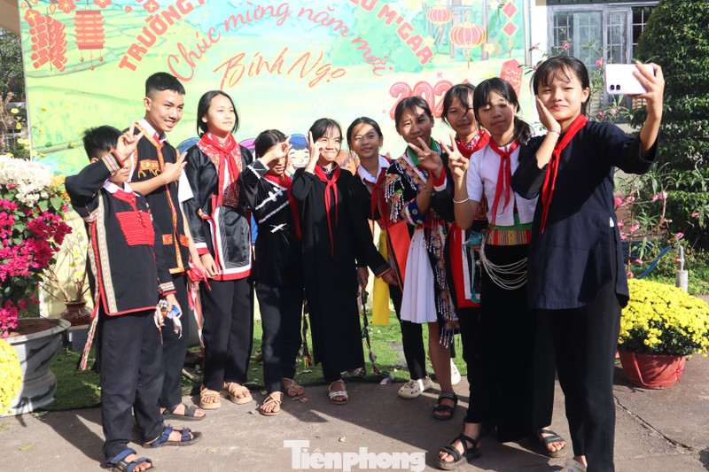 Học sinh trong trang phục truyền thống rực rỡ cùng nhau chụp ảnh, lưu giữ những khoảnh khắc ấm áp của Ngày hội đón Tết cổ truyền tại ngôi trường nội trú.