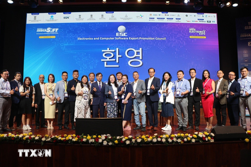 Đoàn lãnh đạo, đại diện hiệp hội, doanh nghiệp Việt Nam tại lễ khai mạc IndiaSoft 2026. (Ảnh: Ngọc Thúy/TTXVN)Từ ngày 23-25/3, tại Trung tâm Triển lãm quốc tế Bharat Mandapam ở thủ đô New Delhi, Ấn Độ đã diễn ra Triển lãm IndiaSoft Expo 2026 do Hội đồng Xúc tiến Xuất khẩu Điện tử và Phần mềm (ESC) thuộc Bộ Công thương Ấn Độ tổ chức.