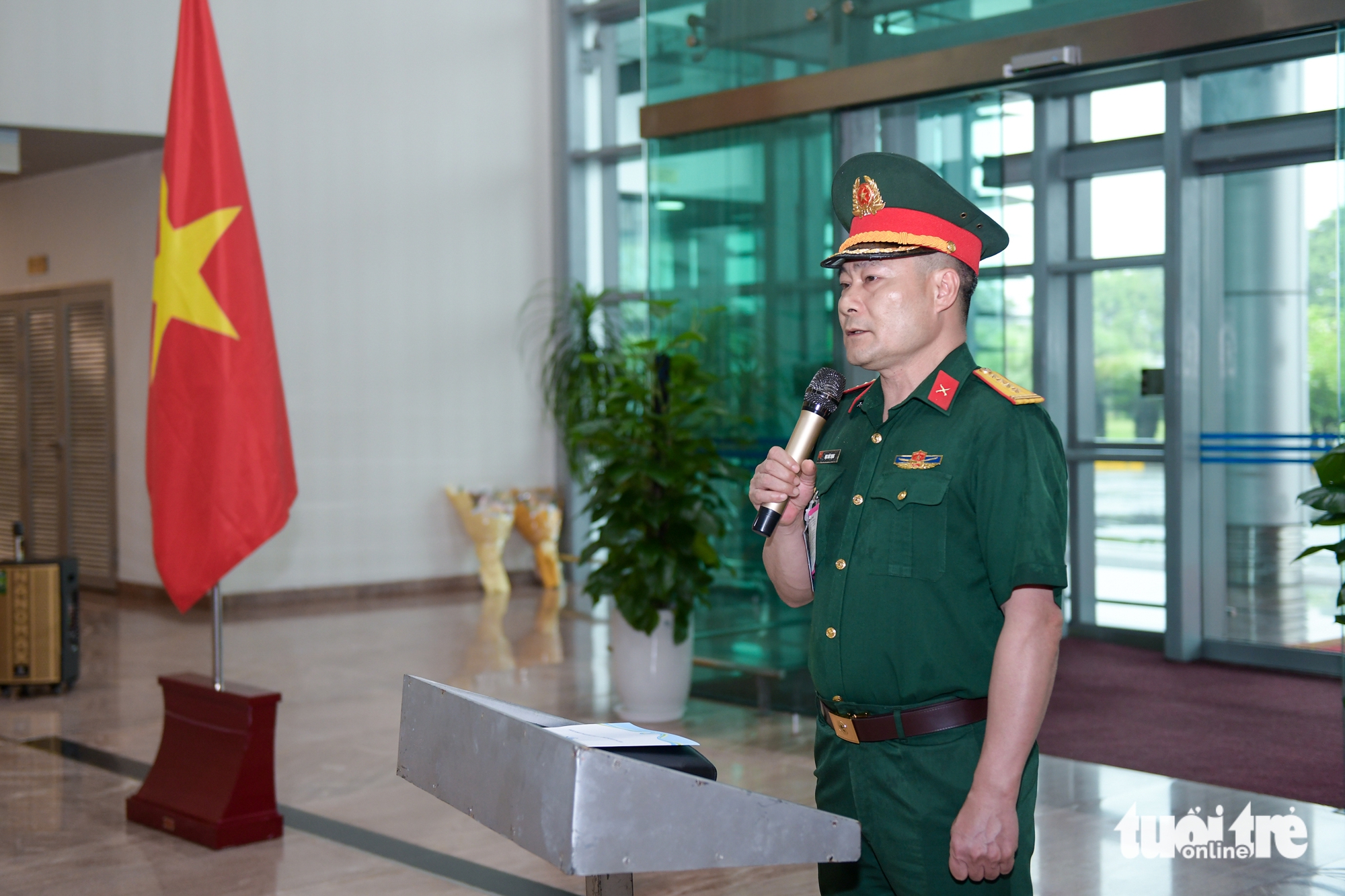 Đại tá Mạc Đức Trọng phát biểu tại lễ đón - Ảnh: NAM TRẦNNgoài ra, đội còn xuất sắc thi công hai công trình nhà kho chiến lược của Liên hợp quốc (warehouse) quy mô hiện đại, hoàn thành vượt tiến độ giữa điều kiện mưa gió khắc nghiệt, thể hiện năng lực thi công công trình phức tạp, tầm cỡ.