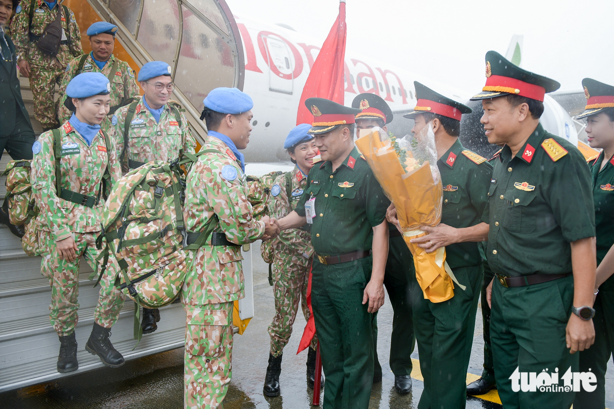 Đại tá Mạc Đức Trọng, Phó cục trưởng Cục Gìn giữ hòa bình, bắt tay với trung tá Phạm Văn Hảo, đội trưởng Đội công binh số 3 Việt Nam và các cán bộ, nhân viên tại sân bay Nội Bài - Ảnh: NAM TRẦNTheo báo cáo từ Cục Gìn giữ hòa bình, Đội công binh số 3 đã hoàn thành xuất sắc nhiệm kỳ gìn giữ hòa bình tại phái bộ UNISFA, khu vực Abyei, để lại dấu ấn chuyên nghiệp và đầy nhân văn.