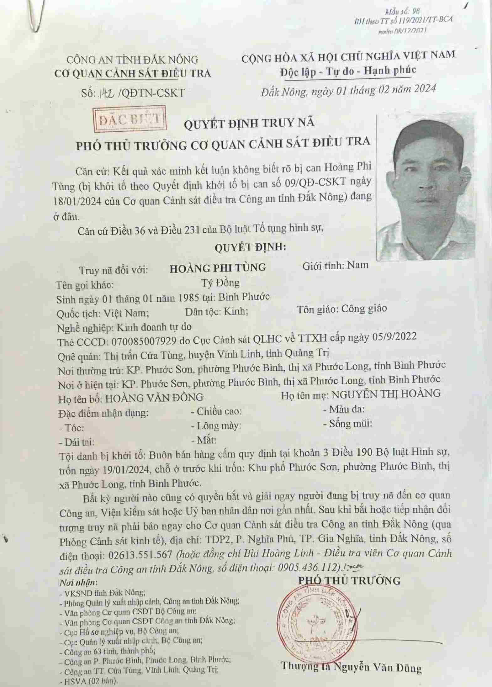 Quyết định truy nã đối tượng Hoàng Phi Tùng. Ảnh: Công an cung cấpSau khi bị phát hiện hành vi phạm tội, đối tượng đã bỏ trốn khỏi nơi cư trú tại phường Phước Bình, thị xã Phước Long, tỉnh Bình Phước.