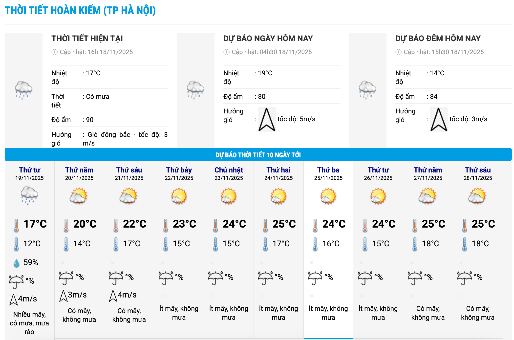 Biểu đồ nhiệt trong 10 ngày tới ở phường Hoàn Kiếm, Hà Nội cập nhật vào 16 giờ ngày 18.11. Ảnh: Trung tâm Dự báo Khí tượng Thủy văn Quốc giaKhu vực Bắc Bộ, Thanh Hóa và Nghệ An có mưa, mưa rào; từ ngày 19.11 có mưa vài nơi. Trời rét, vùng núi và trung du Bắc Bộ trời rét đậm, vùng núi cao có nơi rét hại, vùng đồng bằng Bắc Bộ có nơi rét đậm.