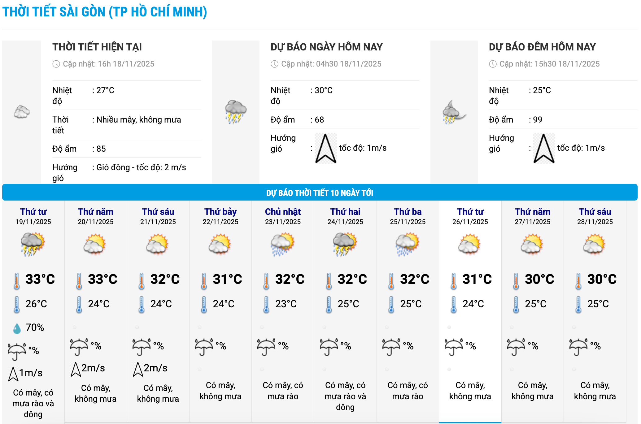 Biểu đồ nhiệt trong 10 ngày tới ở phường Sài Gòn, TPHCM cập nhật vào 16 giờ ngày 18.11. Ảnh: Trung tâm Dự báo Khí tượng Thủy văn Quốc giaKhu vực Bắc Bộ và Bắc Trung Bộ và Quảng Trị có mưa vài nơi, ngày trời nắng. Trời rét, vùng núi Bắc Bộ có nơi rét đậm.