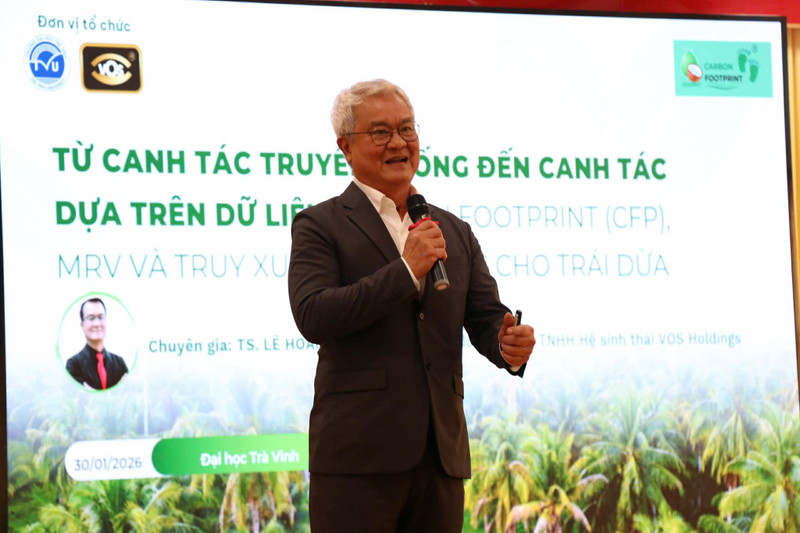 Chuyên gia phát biểu tại tọa đàm.Theo Phó Hiệu trưởng Đại học Trà Vinh, các cam kết tại COP26, cơ chế điều chỉnh biên giới carbon (CBAM) của Liên minh châu Âu hay Quy định chống phá rừng của EU không còn là khái niệm xa vời. Đây là thực tế mà mỗi trái dừa của bà con nông dân phải đối mặt nếu muốn xuất khẩu bền vững.