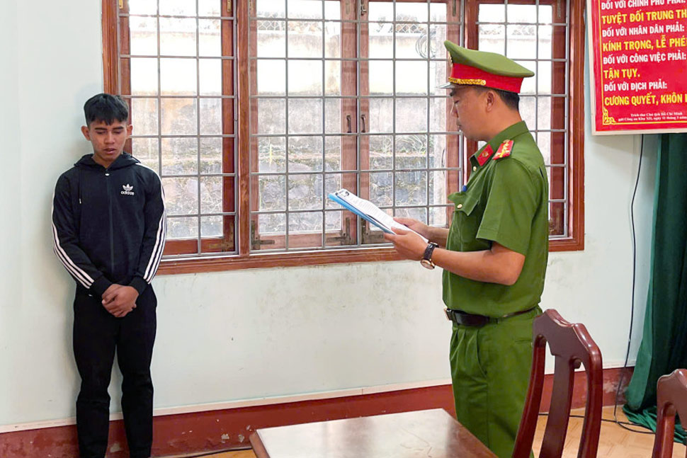 Công an tỉnh Gia Lai thi hành lệnh bắt tạm giam đối với SING. Ảnh: Công anGia Lai - Khi bị lực lượng chức năng ra hiệu lệnh dừng xe kiểm tra, Sing lái xe máy bỏ chạy, lạng lách và tông trọng thương cán bộ CSGT đang làm nhiệm vụ.