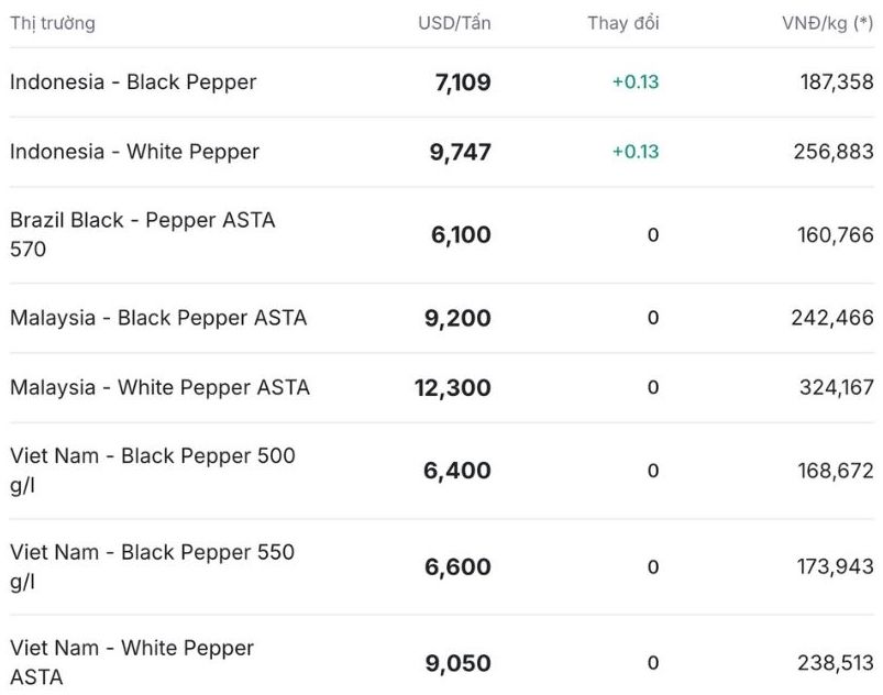 Tại thị trường xuất khẩu tiêu của Việt Nam, giá tiêu đen loại 500 g/l và 550 g/l đi ngang, neo ở ngưỡng 6.400 - 6.600 USD/tấn. Giá tiêu trắng ASTA trụ vững ngưỡng giá cao, hiện đứng ở mức 9.050 USD/tấn (tương đương với 238.513 VND/kg).