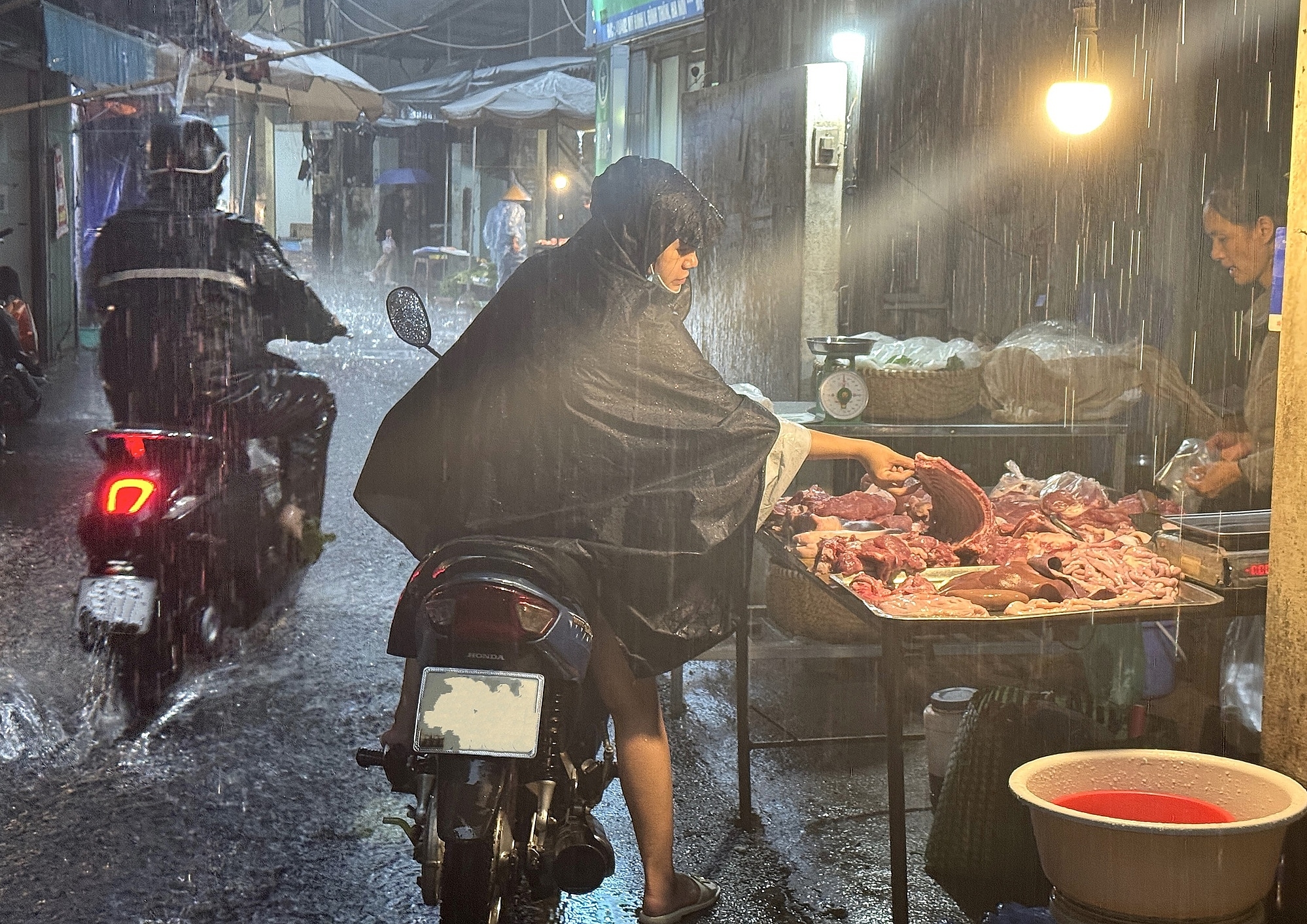 Mưa ngập khiến việc vận chuyển hàng hóa, thực phẩm khó khăn. Tại nhiều chợ dân sinh Hà Nội, các loại thực phẩm thiết yếu như rau, thịt, trứng được người dân tăng mua để tích trữ.