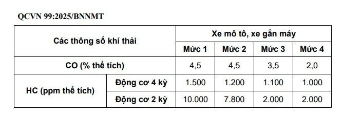 Giá trị giới hạn tối đa cho phép của các thông số CO, HC trong khí thải xe mô tô, xe gắn máy lắp động cơ cháy cưỡng bức tham gia giao thông đường bộ. (Nguồn: Bộ NNMT)Bộ Nông nghiệp và Môi trường vừa ban hành Thông tư số 92/2025/TT-BNNMT về Quy chuẩn kỹ thuật quốc gia về khí thải xe mô tô, xe gắn máy tham gia giao thông đường bộ, có hiệu lực thi hành kể từ ngày 30/6/2026.