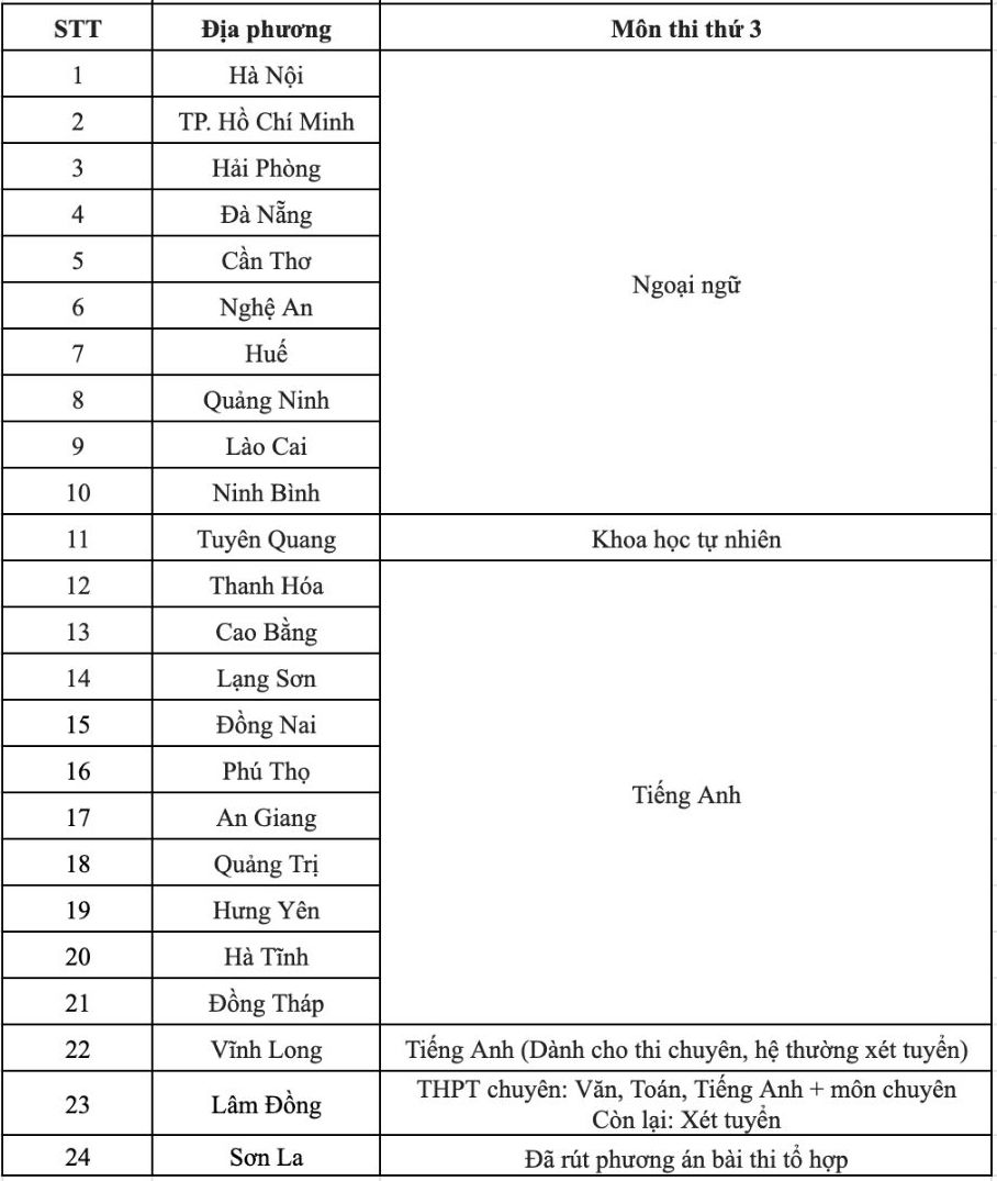Danh sách các tỉnh thành công bố môn thi thứ 3 trong kỳ thi vào lớp 10 THPT năm học 2026 - 2027. Bảng: Phương AnhTrước đó, các địa phương như TP.HCM, Đồng Nai, Đà Nẵng, Huế, Nghệ An, Thanh Hóa, Hải Phòng, Cần Thơ, Lào Cai, Cao Bằng, Quảng Ninh, Lạng Sơn, Đồng Tháp… đều chọn môn thi thứ ba là Ngoại ngữ hoặc Tiếng Anh.
