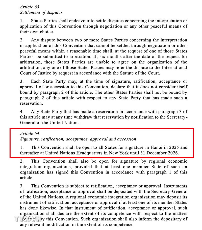 Điều 64 của Công ước quy định văn kiện được mở ký tại Thủ đô Hà Nội trong năm 2025. (Ảnh: TTXVN phát)Trước khi đạt được “trái ngọt” là Lễ mở ký Công ước Liên hợp quốc về chống tội phạm mạng (Công ước Hà Nội), tiến trình đàm phán văn kiện này đã trải qua một hành trình dài, nhiều thời điểm tưởng chừng rơi vào bế tắc.