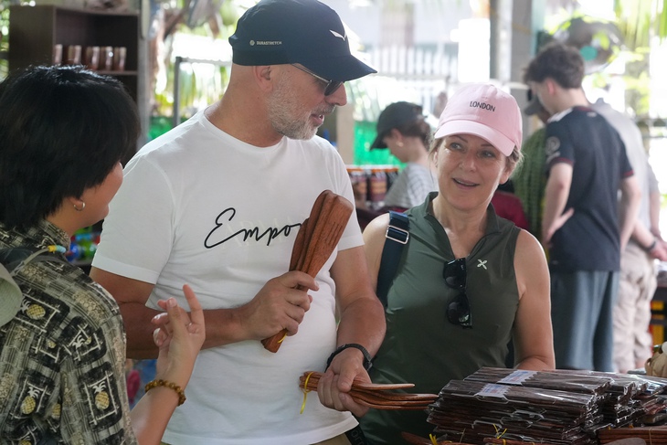 Du khách nước ngoài tìm hiểu các sản phẩm thủ công mỹ nghệ từ dừa tại Khu du lịch sinh thái Thanh Thanh (Vĩnh Long) - Ảnh: HỮU HẠNH