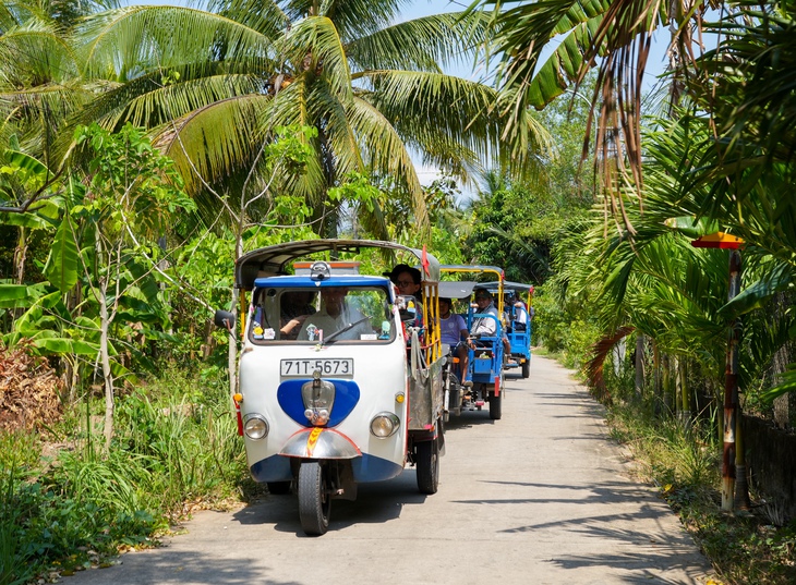 Đoàn khảo sát di chuyển bằng xe lam, tuk tuk từ Khu du lịch sinh thái Lan Vương (phường An Hội) đến làng dệt chiếu Nhơn Thạnh (phường Phú Khương) - Ảnh: HỮU HẠNH