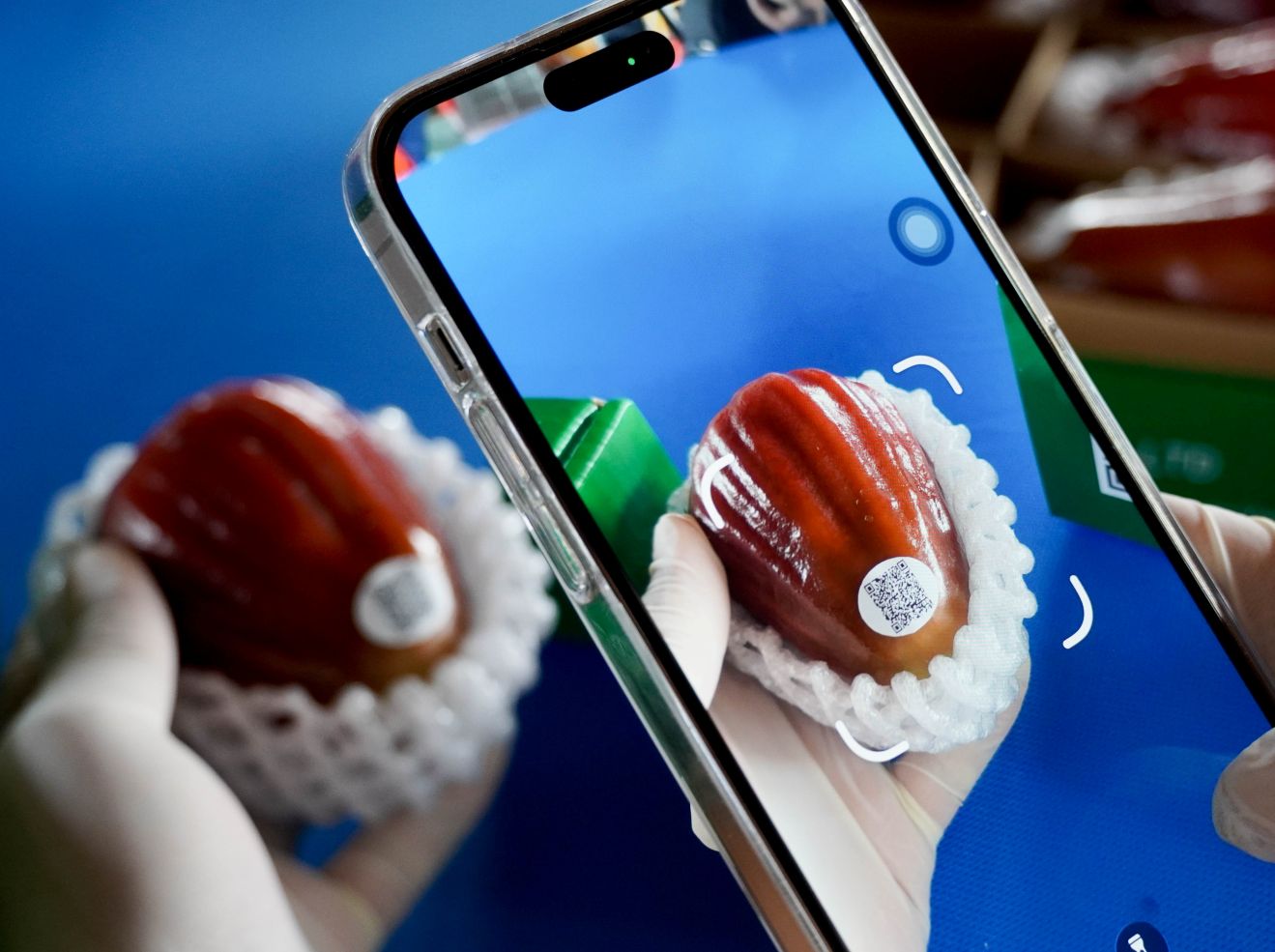 Mỗi trái mận đều được dán mã QR truy xuất nguồn gốc, minh bạch quy trình sản xuất. Ảnh: Phương AnhÔng Phục thông tin thêm mỗi trái mận sau thu hoạch đều được giữ nguyên bao giấy có mã số để phục vụ nhập dữ liệu và truy xuất nguồn gốc. Trước khi đưa ra thị trường, sản phẩm được phân loại, vệ sinh, đóng gói và dán mã QR trên từng trái, giúp người tiêu dùng dễ dàng tra cứu thông tin về vùng trồng, thời gian thu hoạch và quy trình sản xuất.