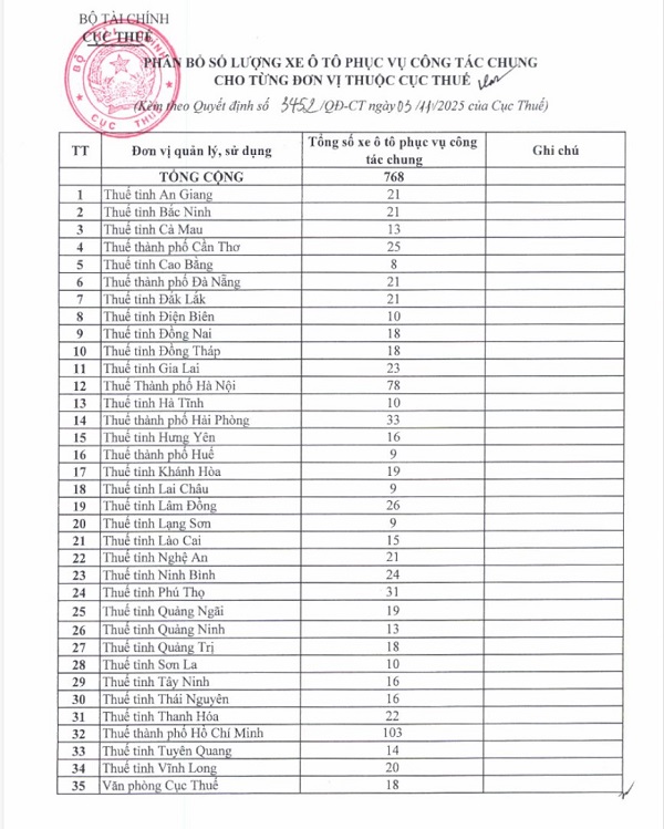 Theo quyết định trên, tổng số xe được phân bổ là 768 xe. Đơn vị được phân nhiều xe nhất là Thuế thành phố Hồ Chí Minh là 103 xe.