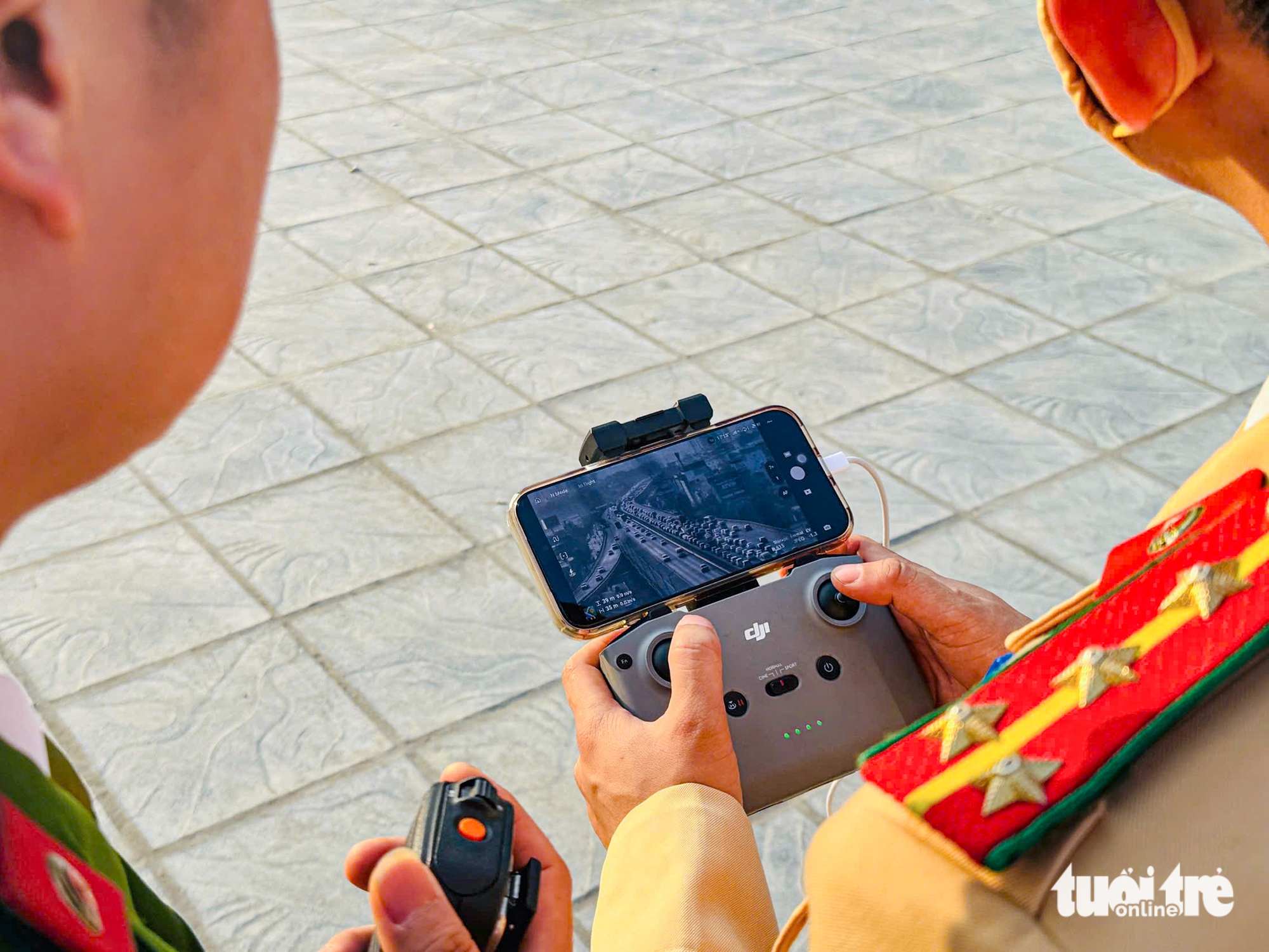 Ngoài việc tuần tra nắm tình hình, cảnh sát còn sử dụng flycam để quan sát các tuyến đường cửa ngõ, vành đai… - Ảnh: HỒNG QUANG