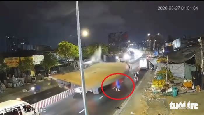 Camera ghi lại khoảnh khắc một nam công nhân may mắn thoát chết trong gang tấc khi tấm thép lớn văng xuống đường sau vụ tai nạn ở cầu Kênh Tẻ, phường Tân Hưng, TP.HCM xảy ra rạng sáng 27-3.