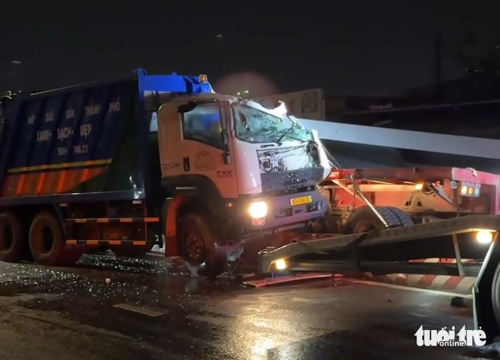 Khoảng 15 giây sau khi xe đầu kéo dừng, một xe rác chạy theo hướng ngược lại, vừa xuống dốc cầu Kênh Tẻ đã va chạm vào một góc của tấm thép nhô ra. Cú tông mạnh khiến đầu xe rác bị biến dạng, nhiều mảnh vỡ văng tung tóe.
