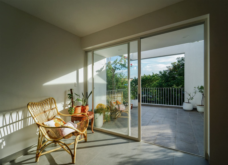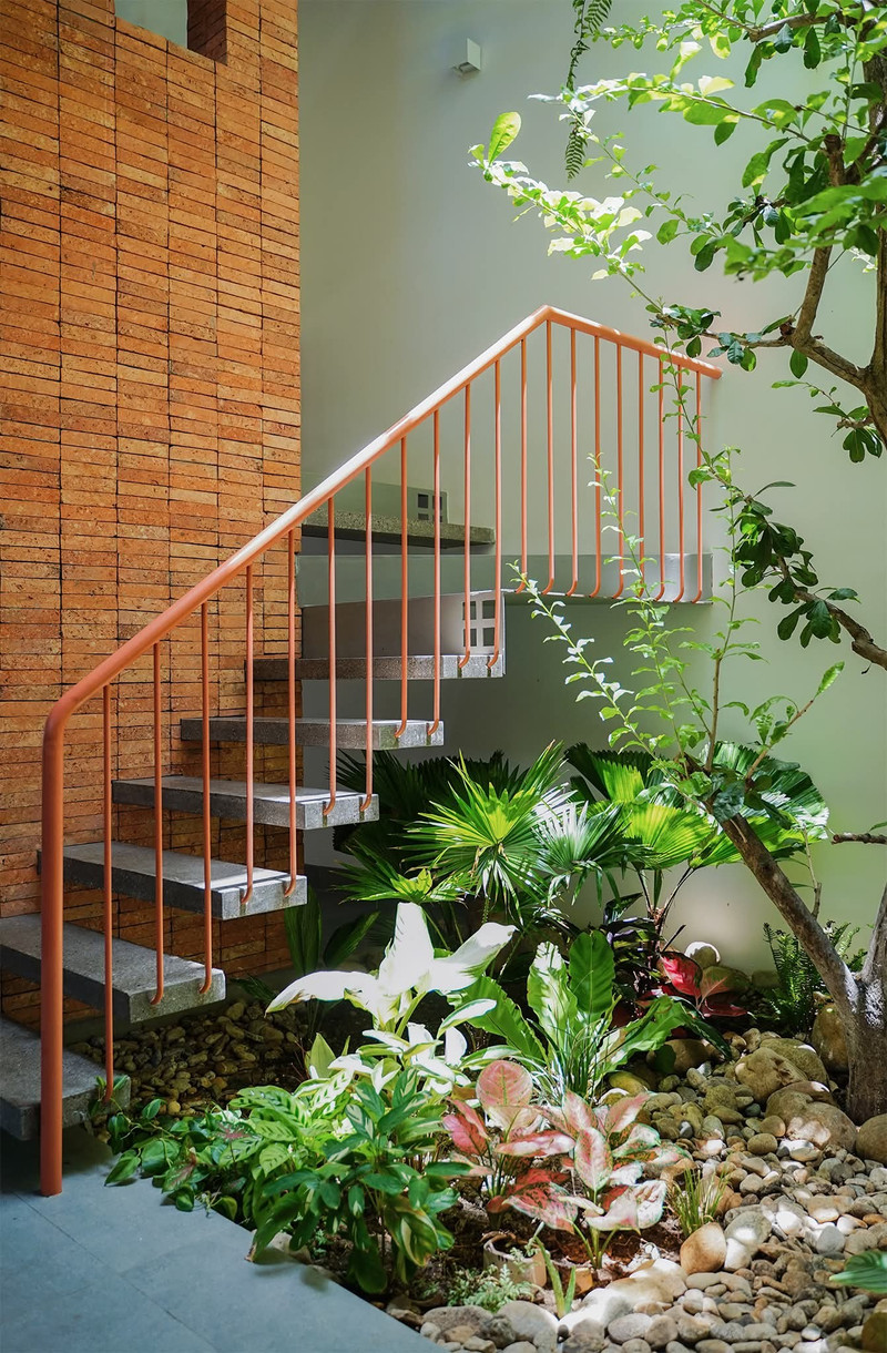 Căn nhà hướng nội nhưng vẫn giữ được sự kết nối với mặt tiền kín đáo được trổ những khoảng trống đan xen.
