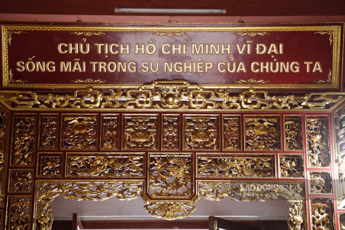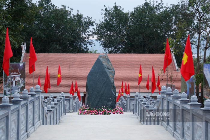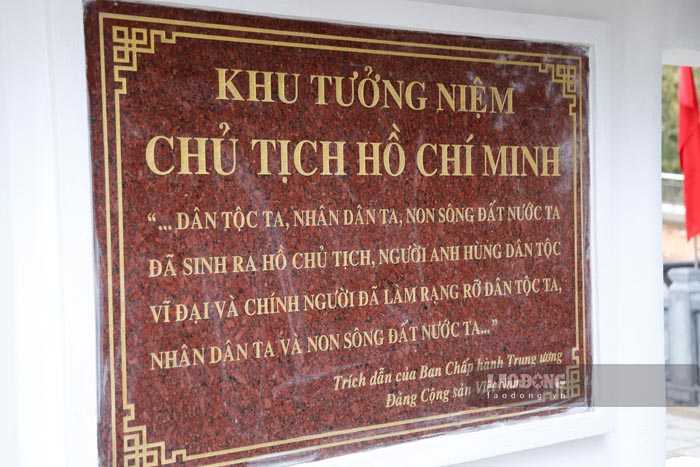 Bia di tích trích dẫn lời dạy của Chủ tịch Hồ Chí Minh. Ảnh: Quang ĐạtTừ Nhà trưng bày đi lên Nhà tưởng niệm có bố trí chiếu nghỉ và đặt bia di tích là một phiến đá tự nhiên. Trên bia di tích trích dẫn lời dạy của Chủ tịch Hồ Chí Minh: “Đoàn kết, đoàn kết, đại đoàn kết. Thành công, thành công, đại thành công”.