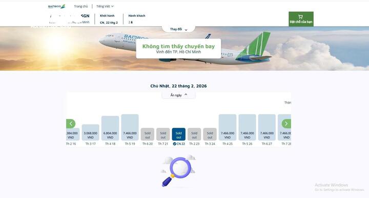 Bamboo "cháy" vé máy bay chuyến Vinh - TP.HCM mùng 6 Tết 2026. (Ảnh chụp màn hình)Nhu cầu tăng cao, giá khó giảm cho đến Tết