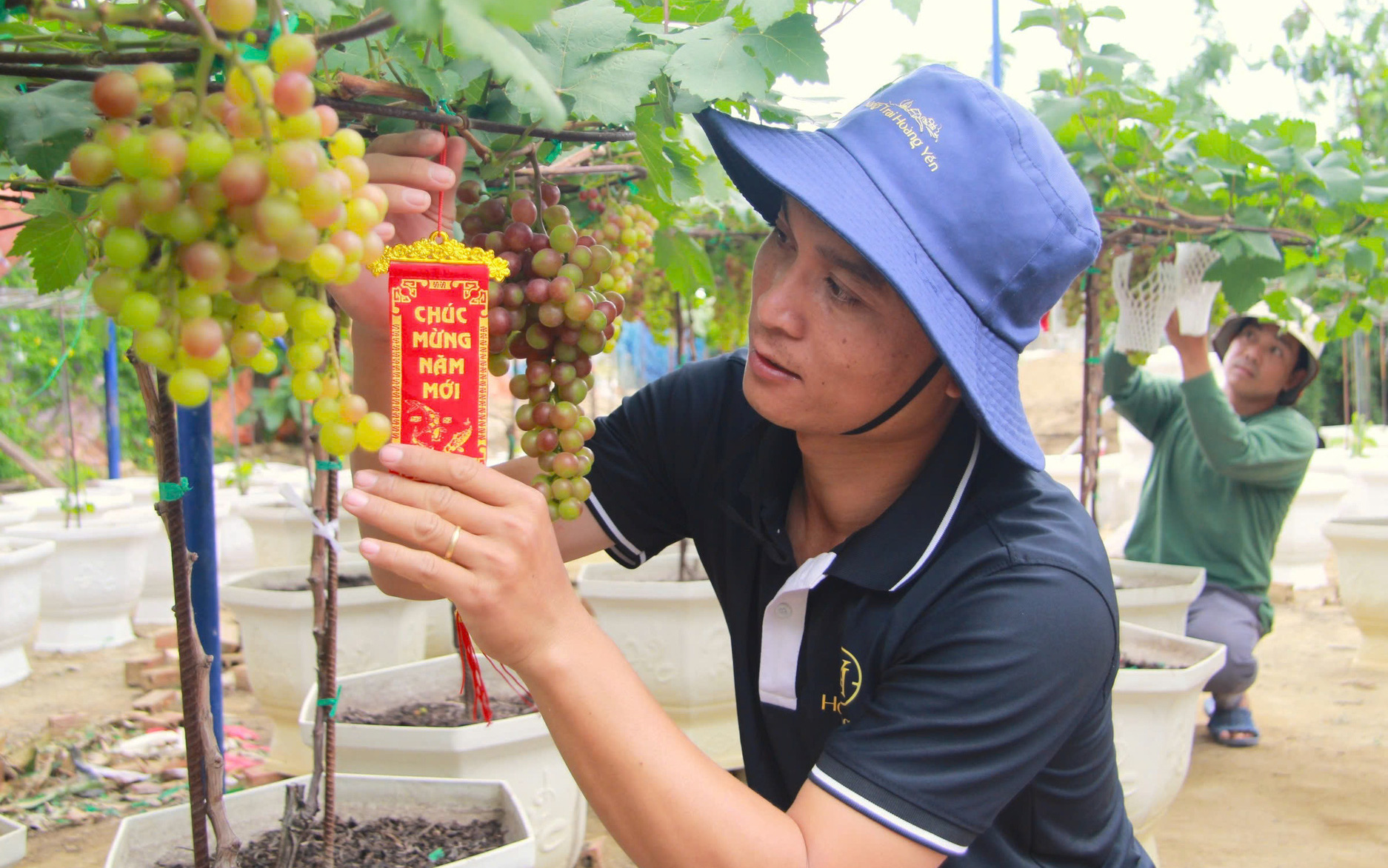 Những ngày này, anh Tống Minh Hoàng (xã Ninh Phước) luôn có mặt ngoài vườn từ sáng sớm để chăm sóc giàn nho 5 sào (5.000m2) đang chín rộ. Với người trồng nho, vụ Tết là vụ mùa quan trọng nhất trong năm, quyết định phần lớn thu nhập. "Có nho bán Tết là coi như cả năm đỡ vất vả", anh Hoàng nói.
