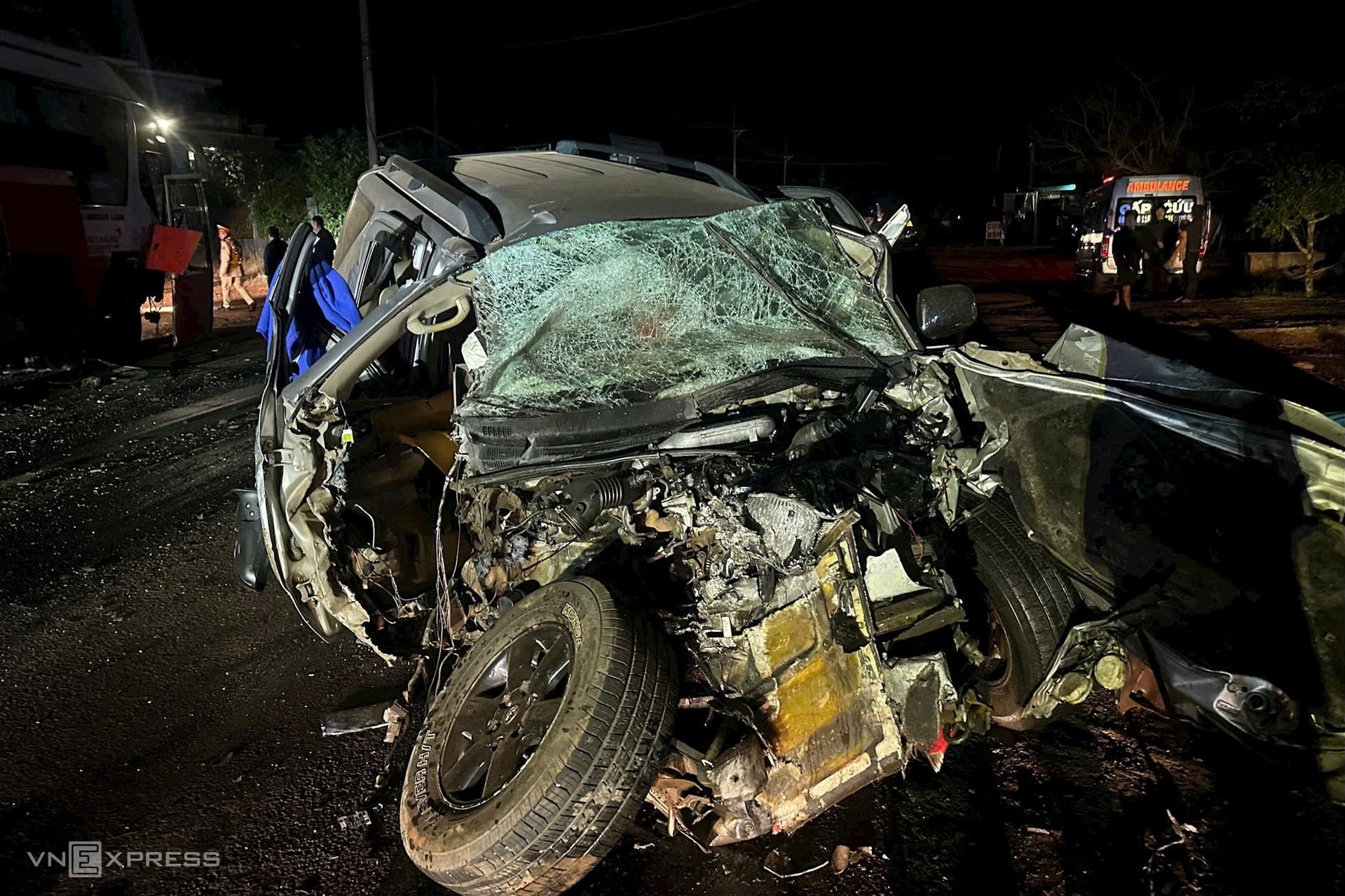 Cú tông mạnh khiến ôtô 7 chỗ biến dạng, hai người ngồi sau tử vong tại chỗ, ông Quảng bị thương được đưa tới Bệnh viện Đăk Nông cấp cứu. Hai xe hư hỏng nặng.